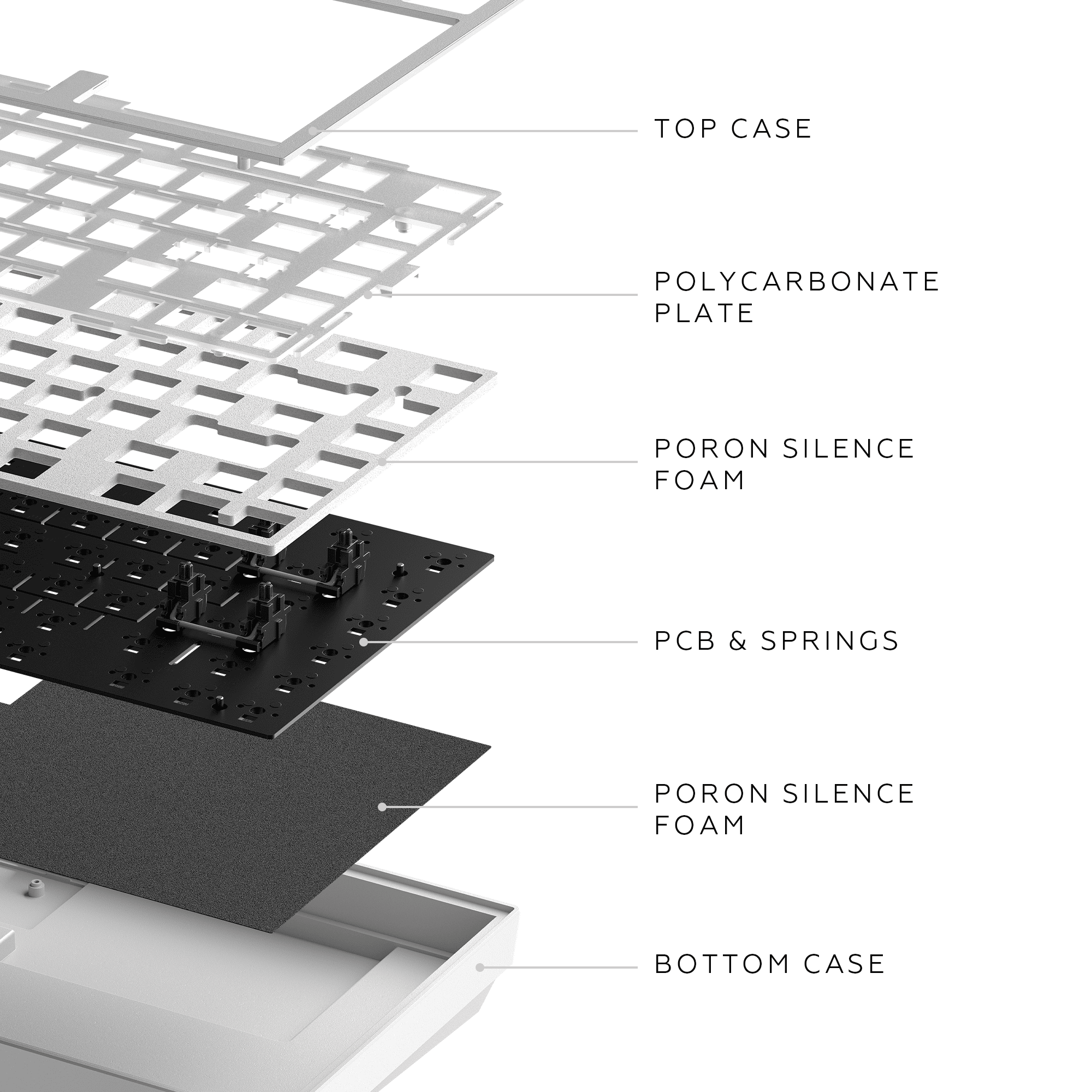 Pouzdro klávesnice se skládá ze tří hlavních součástí: horního a spodního krytu (pouzdra), hlavní nosné konstrukce (desky šasi) a desky s plošnými spoji (PCB). Mezi deskou plošných spojů a deskou šasi a mezi deskou šasi a spodním krytem pouzdra jsou umístěny dvě vrstvy pěny Poron. Krabice navíc obsahuje dvě vrstvy silikonu, což vám dává možnost nahradit pěnu Poron silikonem, pokud si přejete změnit akustiku klávesnice!