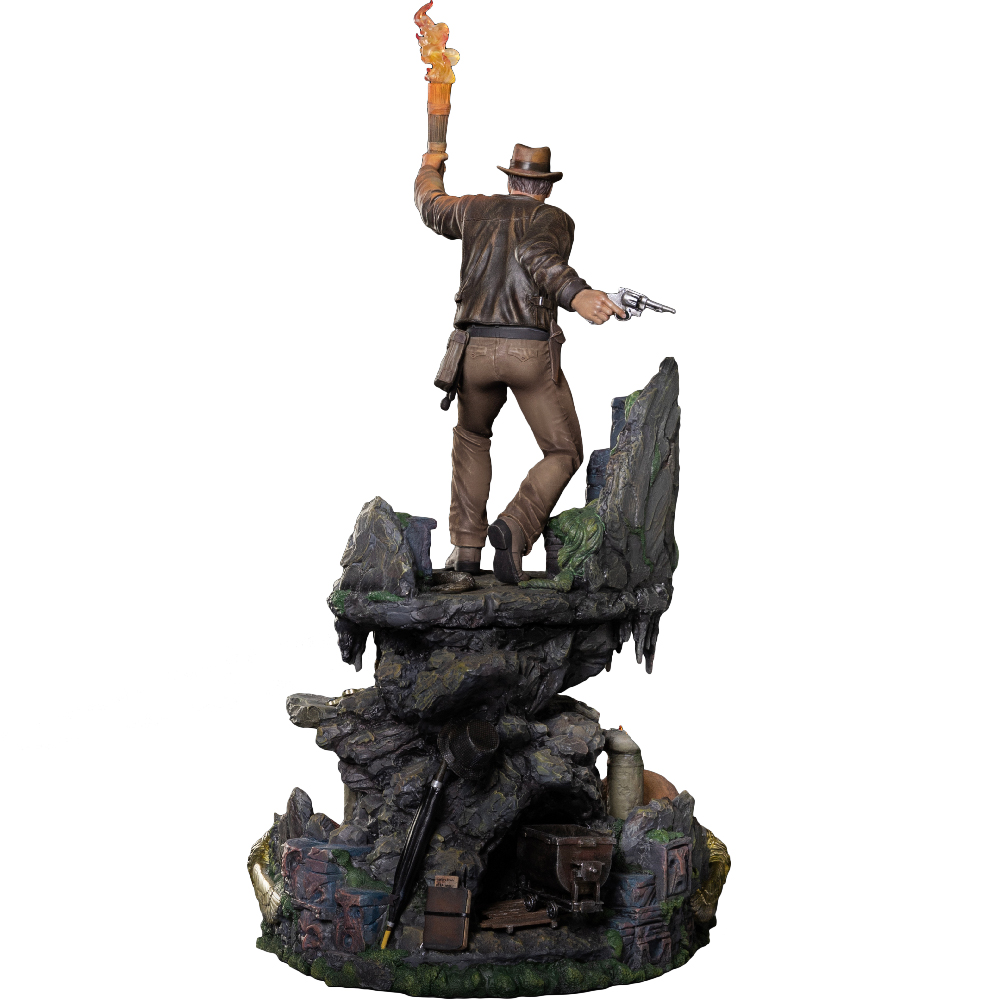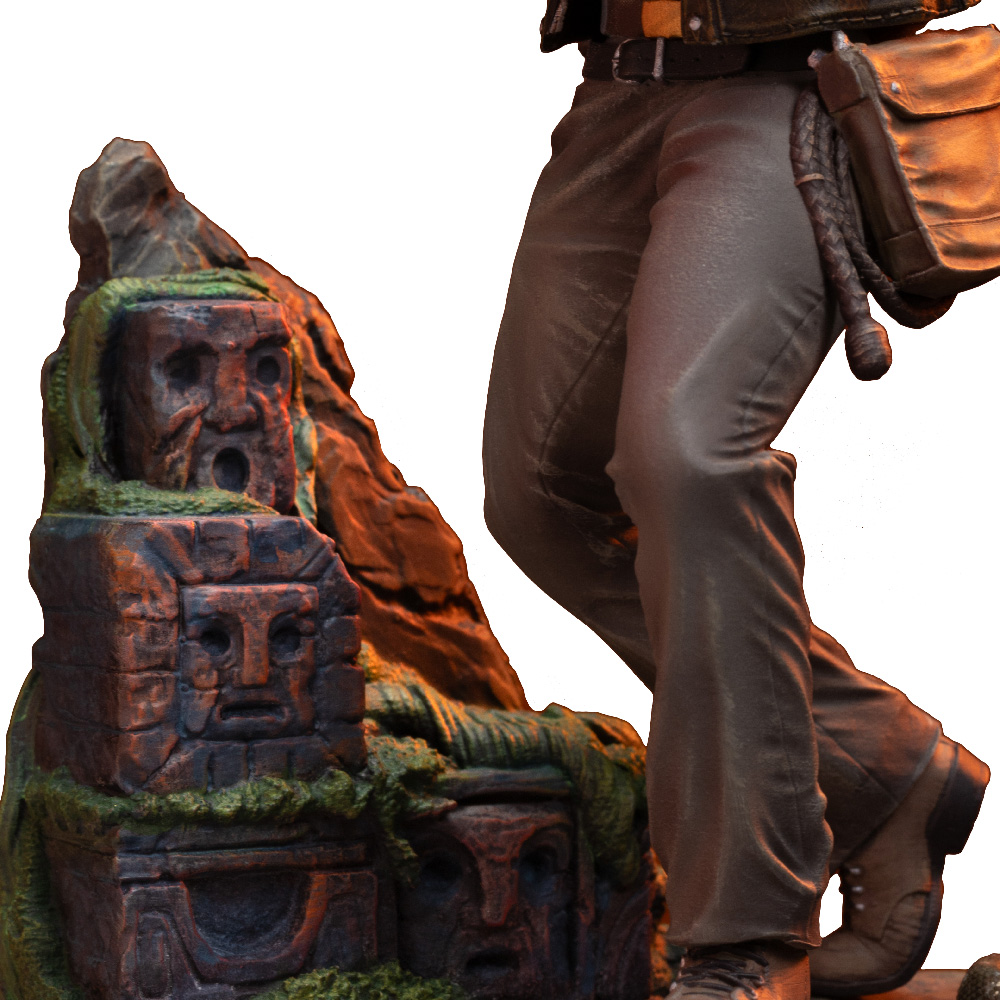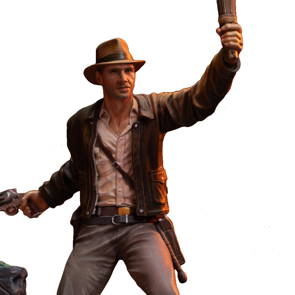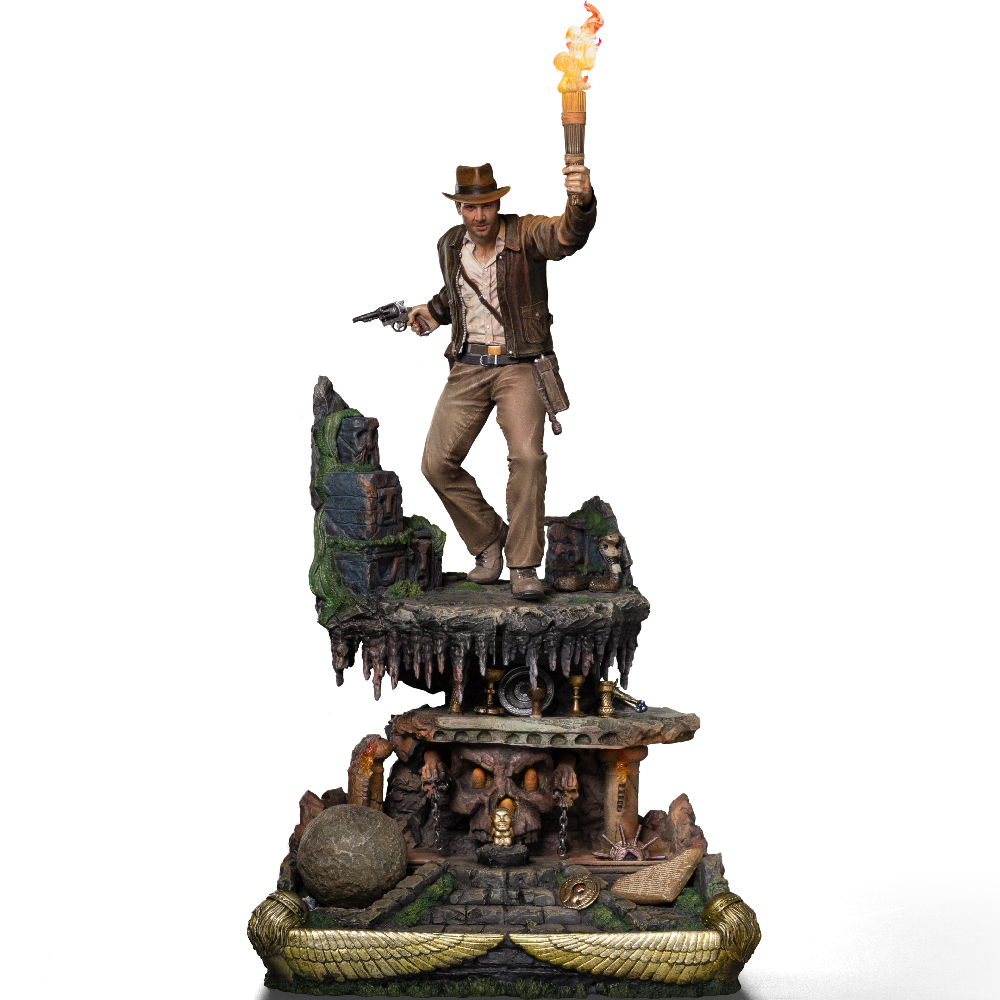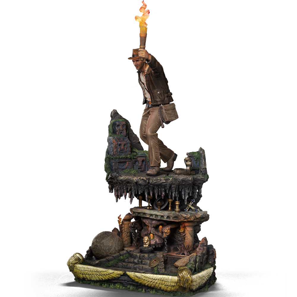 Uvnitř zříceniny chrámu, starobylé stavby vybavené mnoha tajnými pastmi, se odvážný dobrodruh a lovec starověkých pokladů prodírá temnotou s pochodní v levé ruce a zároveň je připraven na nebezpečí, protože v pravé ruce třímá revolver Colt. Na sobě má tradiční tmavě hnědou koženou bundu přes košili v barvě kamene, hnědé kalhoty přidržované opaskem a svůj neodmyslitelný klobouk Fedora s vysokou korunou a širokou krempou a pod bundou vždy nosí také koženou tašku přes rameno s popruhem, do které ukládá kořist ze svých výprav. Nosí také hnědé boty a opasek, v němž má pouzdro na zbraň a bič. Na dioramatickém podstavci plném odkazů na jeho dobrodružství na velkém plátně, jako je Zlatá modla Chachapoyan, kameny se šipkami z Chrámu bojovníků Chachapoyan, obrovská klasická kulovitá skalní past, andělé z víka Archy úmluvy, lebka s legendárními Sankarskými kameny v očích, důlní vozík z jednoho z útěků, klobouk jeho otce, Svatý grál a další padělky, had Naja u jeho nohou a mnoho dalšího. Iron Studios hrdě představuje svou sošku "Indiana Jones - Indiana Jones - Deluxe Art Scale 1/10", první vydání největšího archeologického hrdiny v popkultuře od Iron Studios!