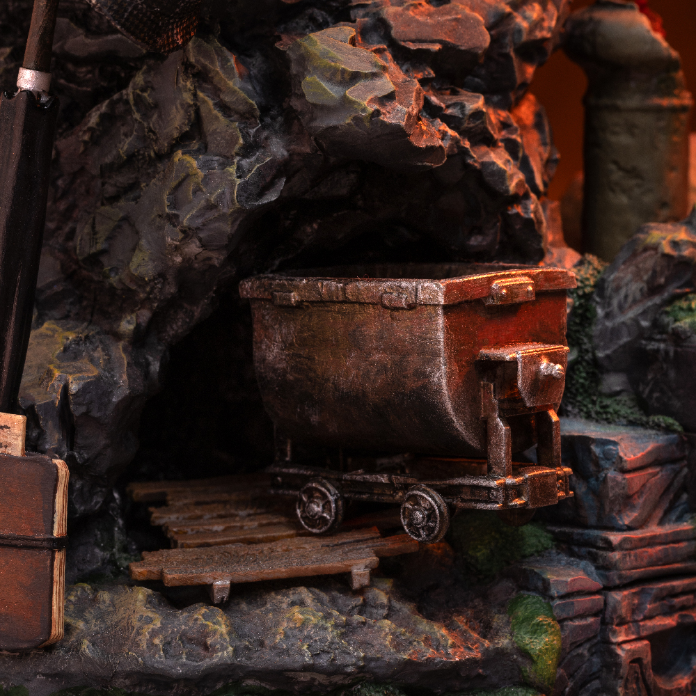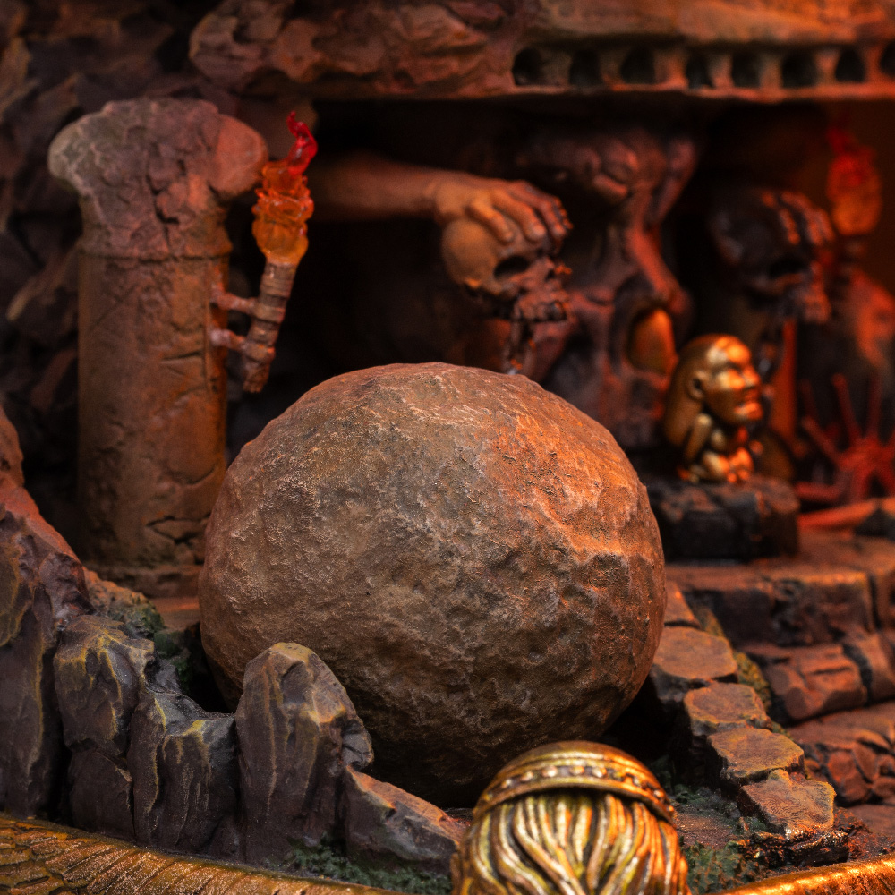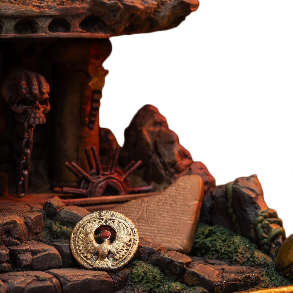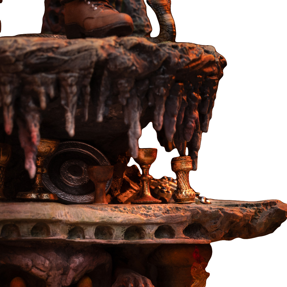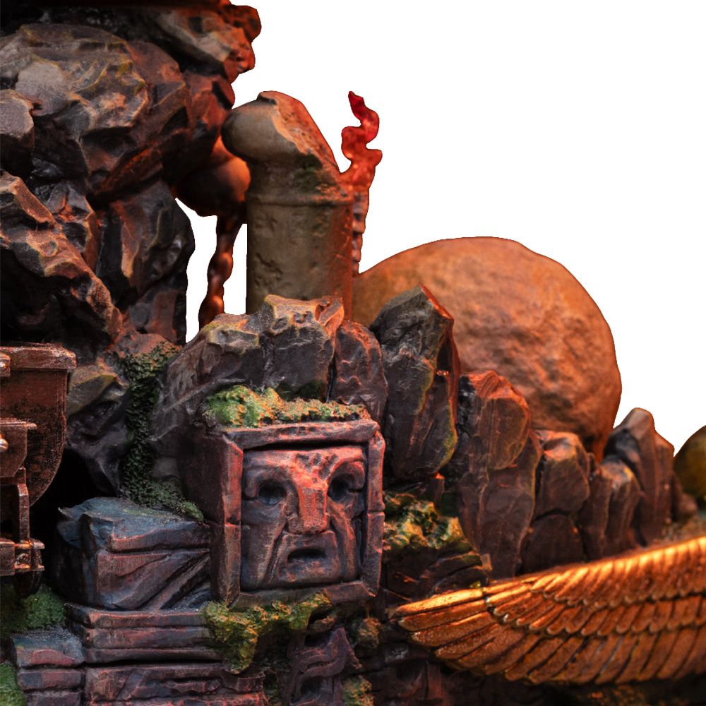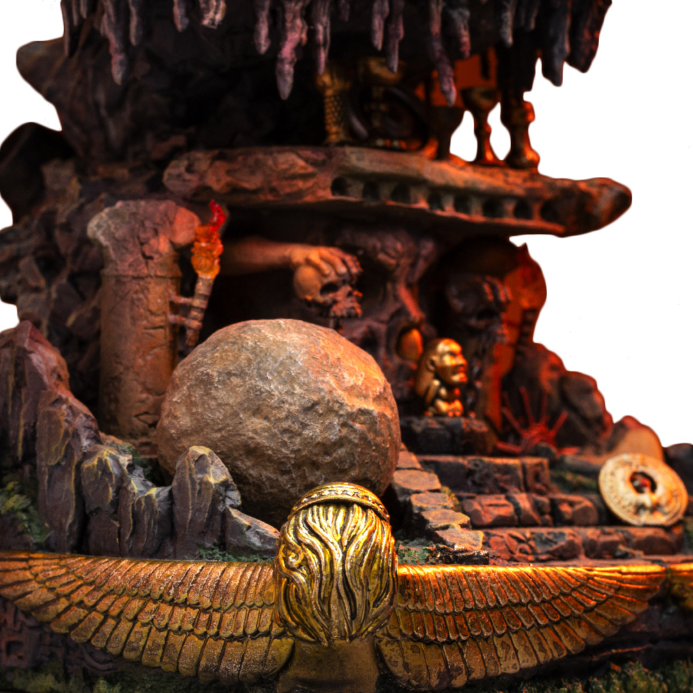 Uvnitř zříceniny chrámu, starobylé stavby vybavené mnoha tajnými pastmi, se odvážný dobrodruh a lovec starověkých pokladů prodírá temnotou s pochodní v levé ruce a zároveň je připraven na nebezpečí, protože v pravé ruce třímá revolver Colt. Na sobě má tradiční tmavě hnědou koženou bundu přes košili v barvě kamene, hnědé kalhoty přidržované opaskem a svůj neodmyslitelný klobouk Fedora s vysokou korunou a širokou krempou a pod bundou vždy nosí také koženou tašku přes rameno s popruhem, do které ukládá kořist ze svých výprav. Nosí také hnědé boty a opasek, v němž má pouzdro na zbraň a bič. Na dioramatickém podstavci plném odkazů na jeho dobrodružství na velkém plátně, jako je Zlatá modla Chachapoyan, kameny se šipkami z Chrámu bojovníků Chachapoyan, obrovská klasická kulovitá skalní past, andělé z víka Archy úmluvy, lebka s legendárními Sankarskými kameny v očích, důlní vozík z jednoho z útěků, klobouk jeho otce, Svatý grál a další padělky, had Naja u jeho nohou a mnoho dalšího. Iron Studios hrdě představuje svou sošku "Indiana Jones - Indiana Jones - Deluxe Art Scale 1/10", první vydání největšího archeologického hrdiny v popkultuře od Iron Studios!