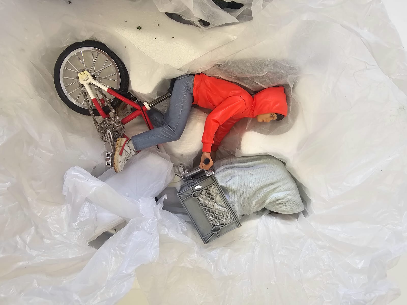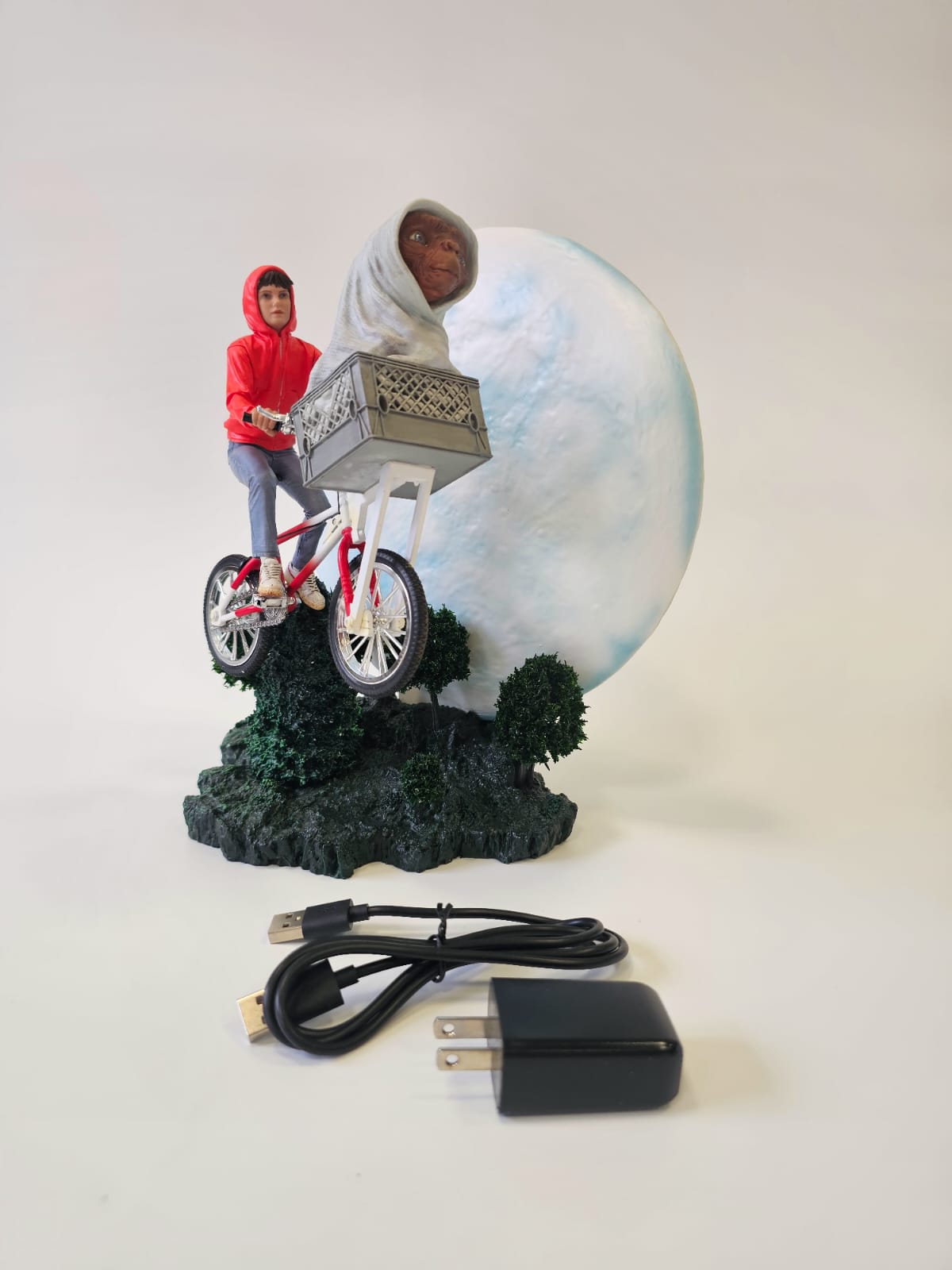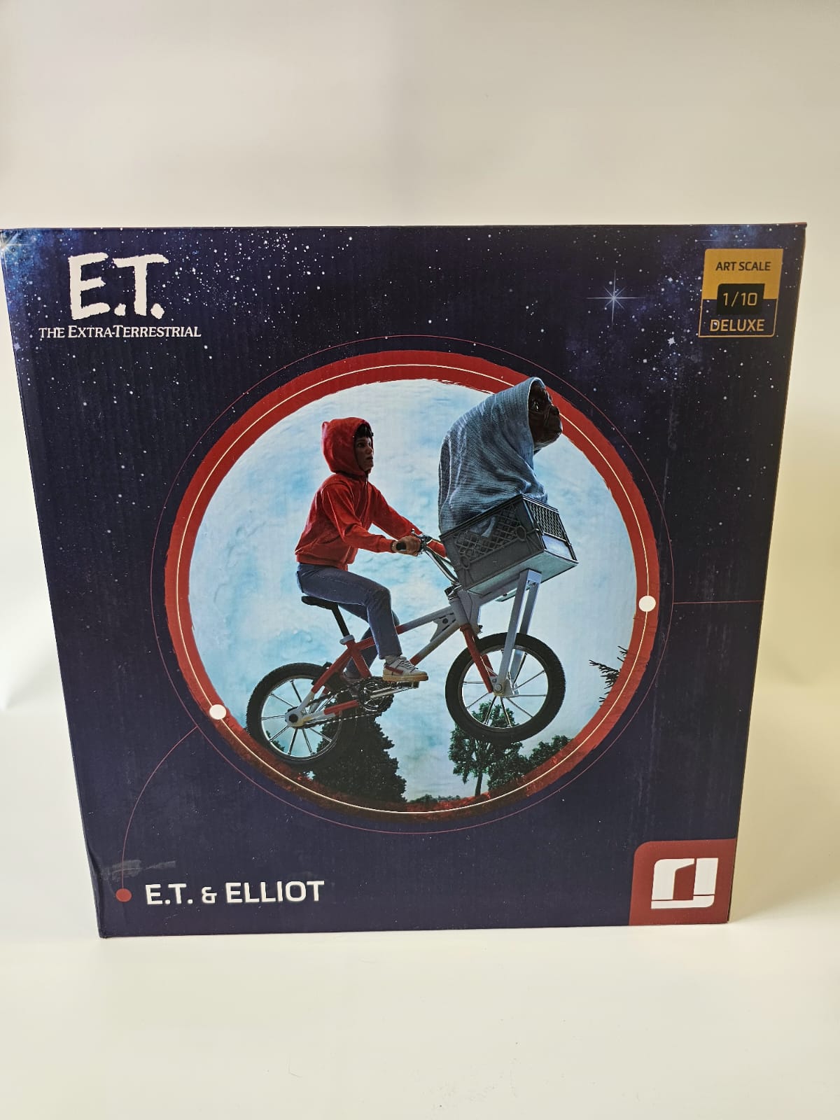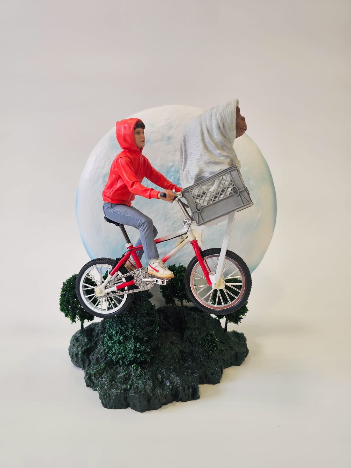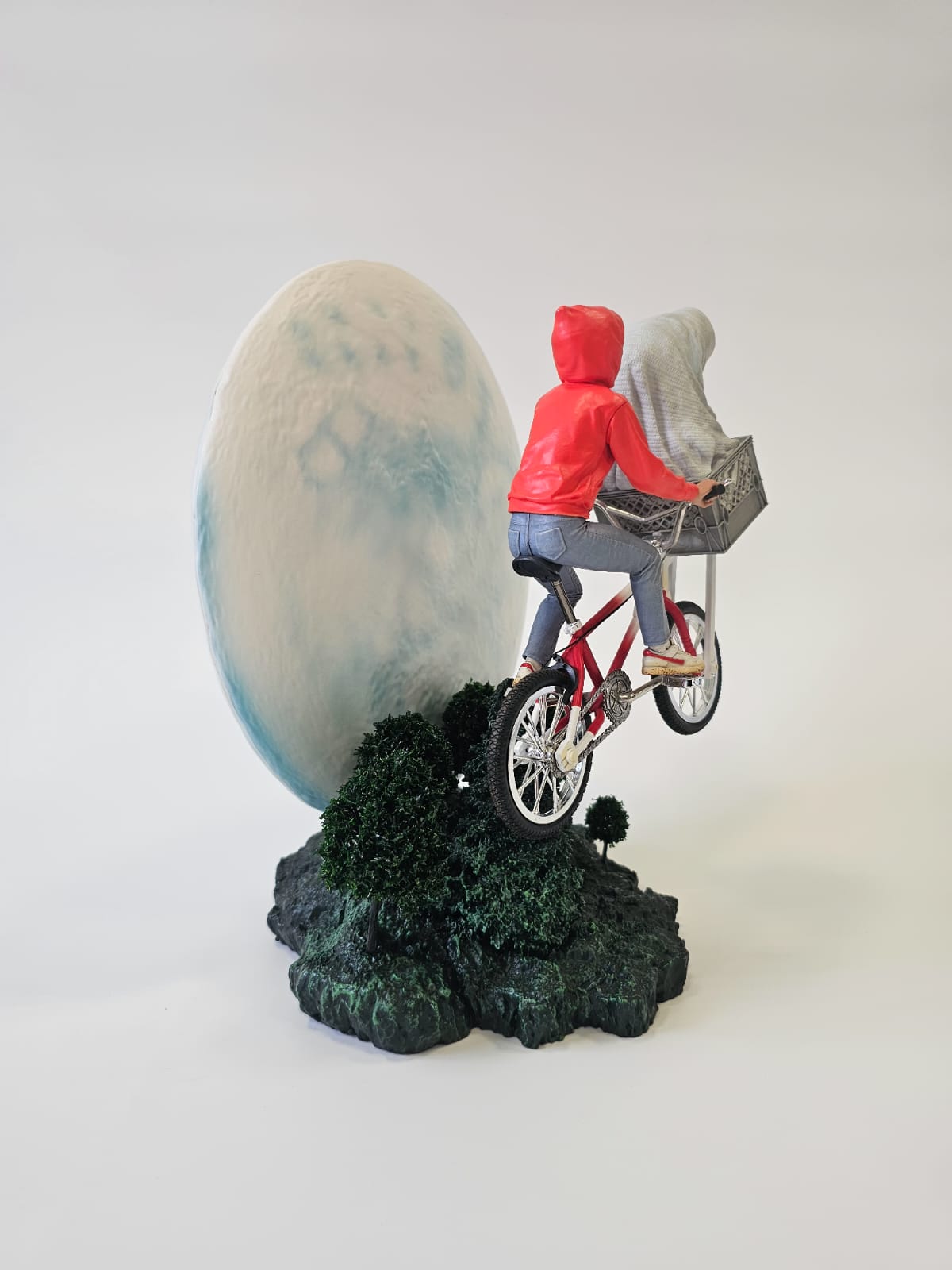 A boy carries in his bicycle basket, wrapped in a white sheet, an unusual friend, a small alien lost on Earth that is being pursued by government forces. In their flight to find their fellow men and return to his world, the two friends run towards a California forest, where the spacecraft that will rescue him must land. To escape a police blockade, the little alien uses its telekinetic abilities to levitate the bike, lifting them into the air and flying over the trees towards their destination. This anthological scene, which has the moon as a backdrop, was also used in the promotion of the film, becoming one of the best known and most striking images in cinema, even becoming the logo of Amblin Entertainment, Steven Spielberg\’s film producer, and now also proudly replicated with the statue \” ET & Elliot – Art Scale 1/10 Deluxe – ET – Iron Studios\”