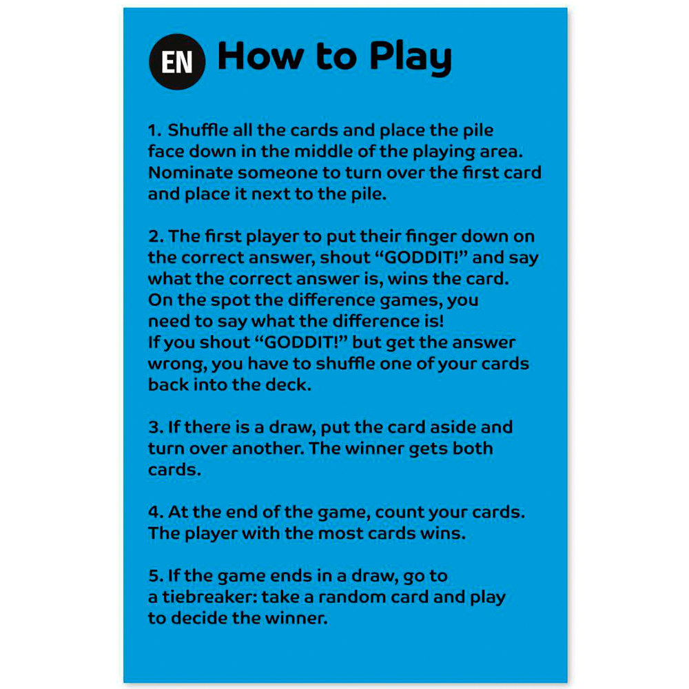 - Fast-Paced Fun – Be the quickest to solve the puzzle, shout “GODDIT!” and claim the card.