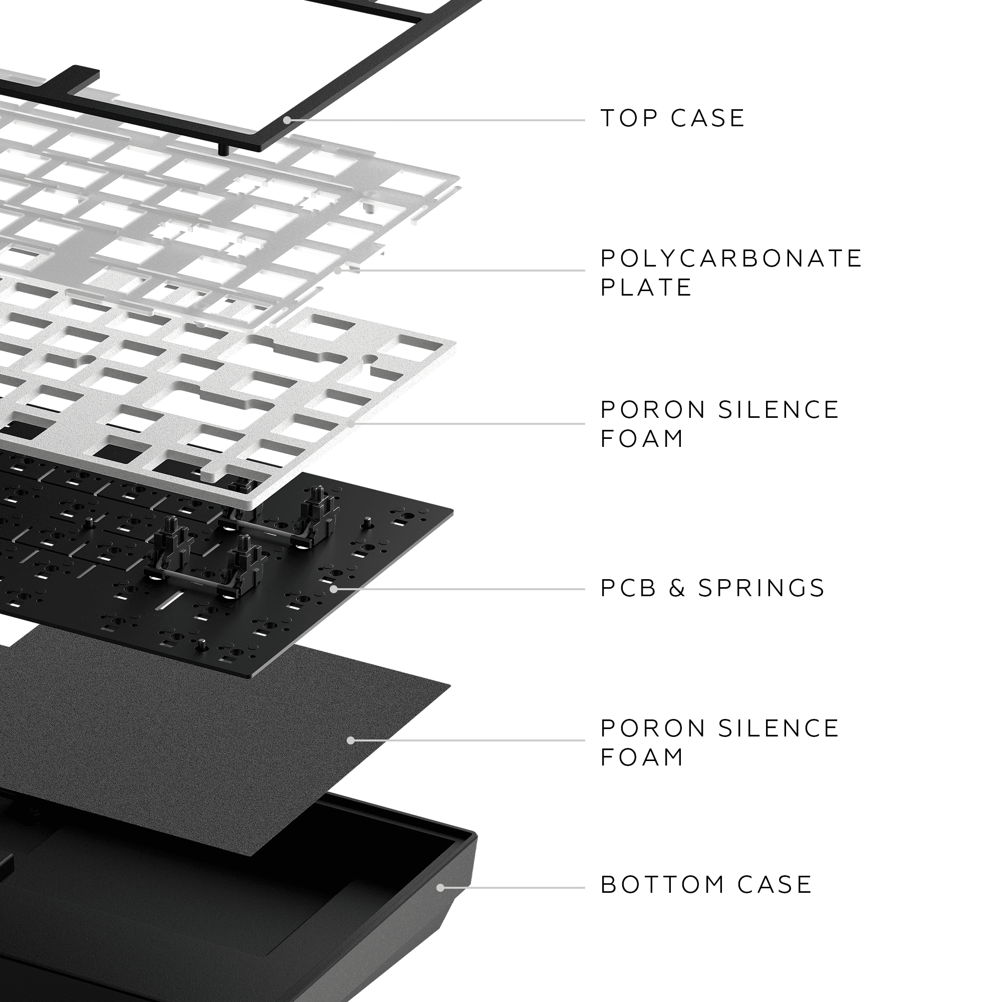 The Keyboard Case consists of three main components: the top and bottom covers (housing), the main supporting structure (chassis plate), and the printed circuit board (PCB). Two layers of Poron foam are positioned between the PCB and the chassis plate, as well as between the chassis plate and the bottom cover of the housing. Additionally, the box includes two layers of silicone, giving you the option to replace the Poron foam with silicone if you wish to change the acoustics of your keyboard!