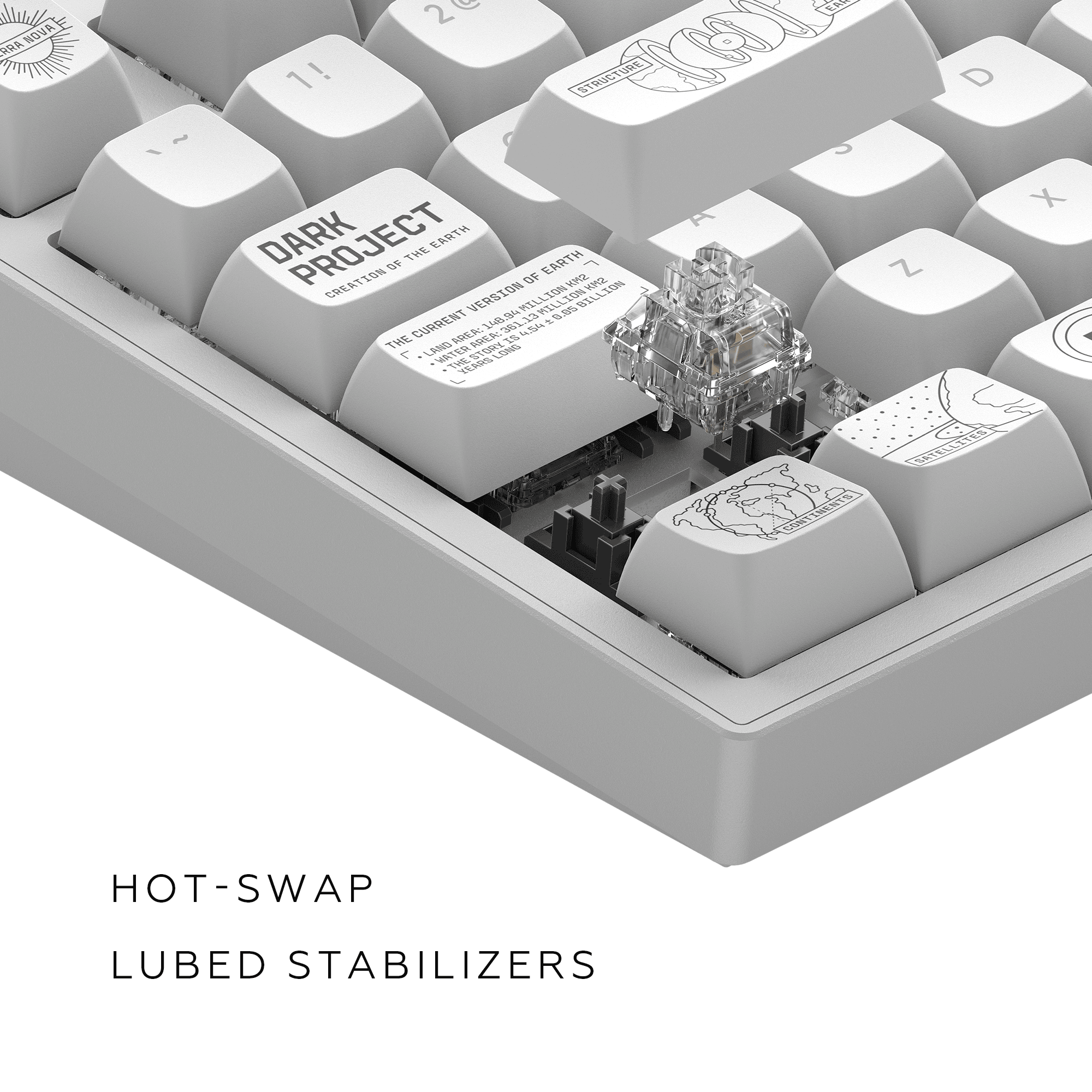 Housed in a full aluminum body with intricate cosmic sketches on the back, it features pre-lubed G3MS Moonstone switches for ultra-smooth typing and Dye-sublimated PBT keycaps that display stunning illustrations of the solar system and Earth’s layers. Every feature is crafted to elevate your experience—from wireless connectivity for seamless freedom to hot-swappable switches for ultimate customization.