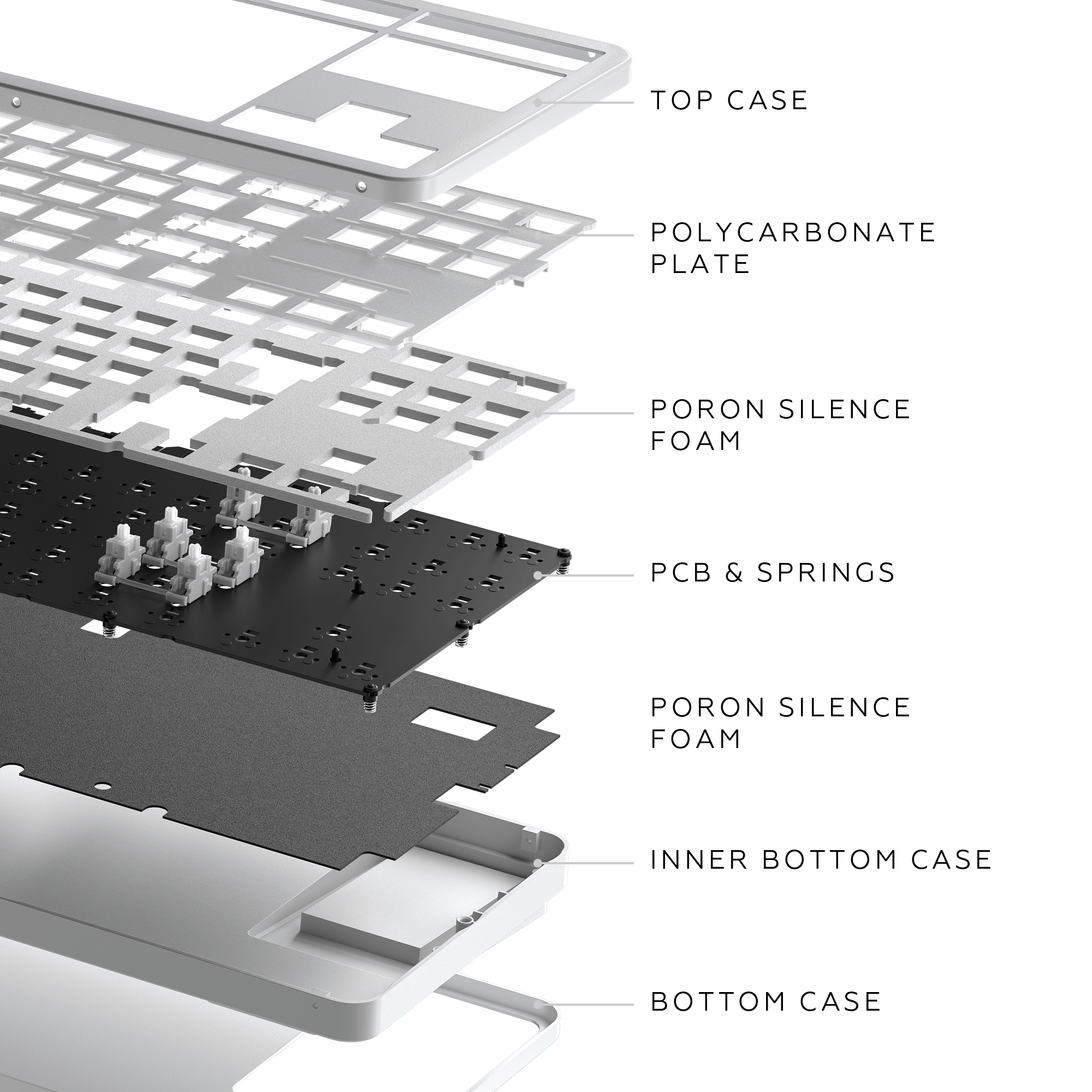 The Keyboard Case consists of three main components: the top and bottom covers (housing), the main supporting structure (chassis plate), and the printed circuit board (PCB). Two layers of Poron foam are positioned between the PCB and the chassis plate, as well as between the chassis plate and the bottom cover of the housing.