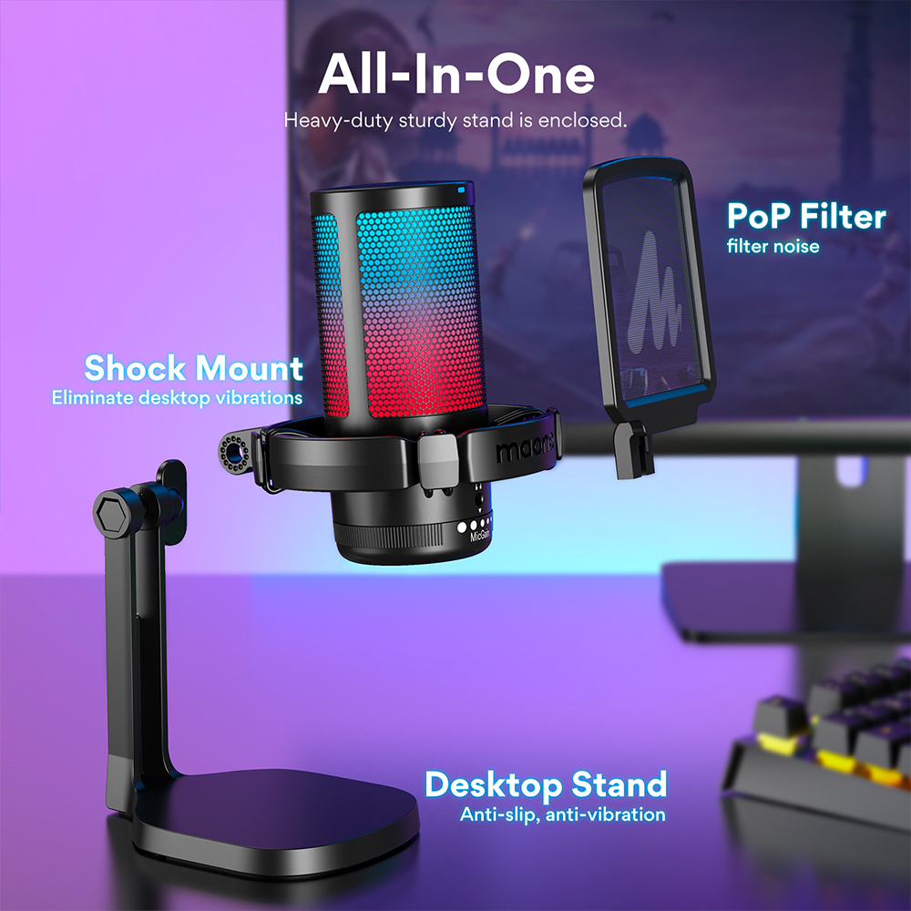 MAONO DGM20 GamerWave Condenser USB Gaming RGB Microphone – Plug & Play Microphone with Noise Cancellation, RGB Lighting, One-Tap Mute, Gain Control, and Zero-Latency Monitoring – Ideal for Gaming, Streaming, and Podcasting