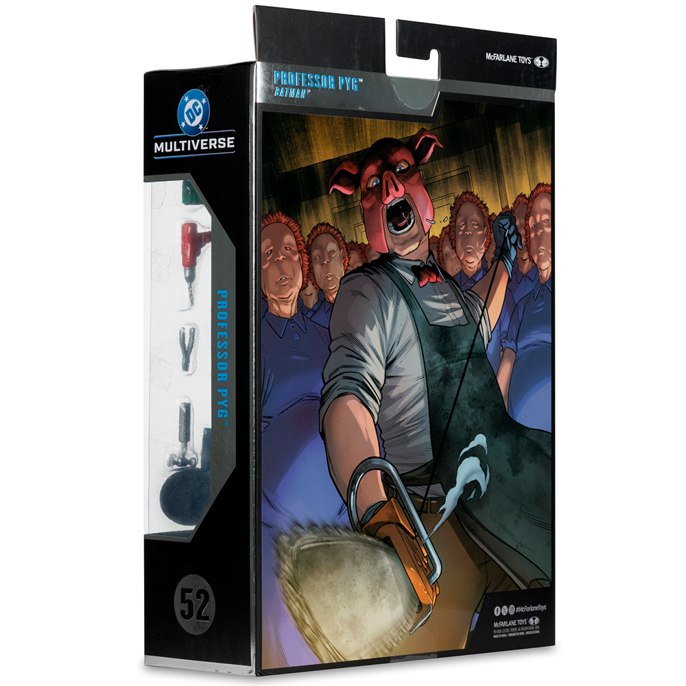 Driven insane by exposure to Doctor Dedalus’ Spyral™ labyrinth, Lazlo Valentin became pig-mask-wearing Professor Pyg. Pyg’s exploits consisted of kidnapping unfortunate Gotham City™ citizens and performing bizarre surgeries on them before adding doll-face masks that turned them into obedient minions called Dollotrons™. A driven free spirit, Pyg frequently opens new “clinics.” His latest foes have included the Teen Titans™, Red Hood™ and the Outlaws™, Nightwing™, and Batman™.