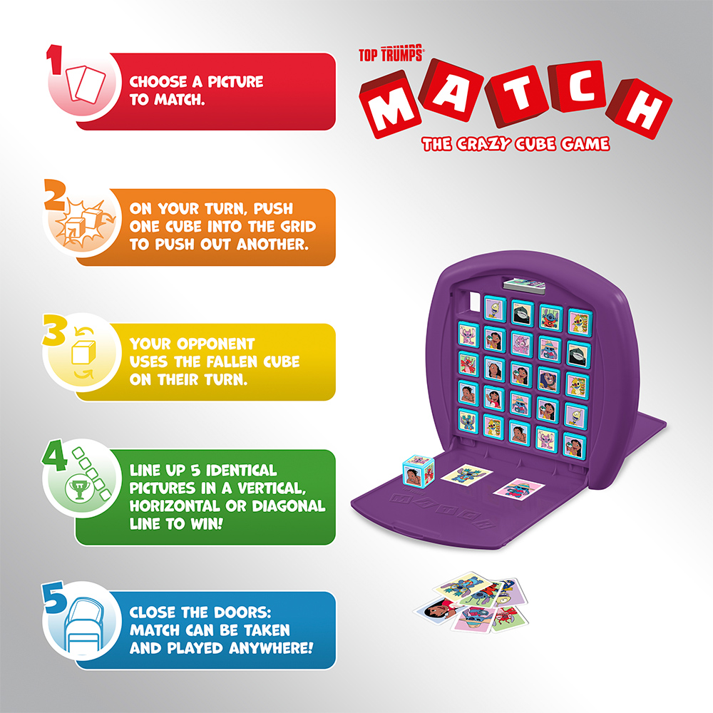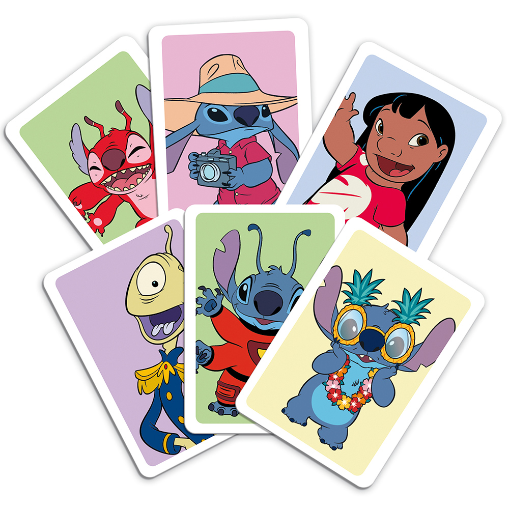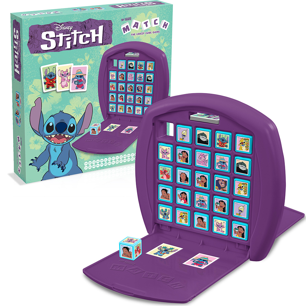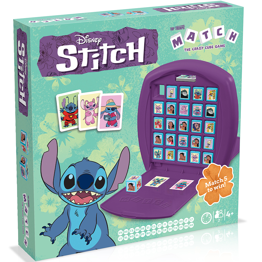 Embark on an intergalactic adventure with Disney Stitch Top Trumps Match, the wildly entertaining crazy cube game that will have you on the edge of your seat! Dive into the charming world of Stitch and his beloved friends as you compete to match five Stitch characters in a row, either horizontally, vertically, or diagonally, to claim victory. But beware, your opponent might just foil your plans with a cunning Top Trumps card that could snatch the game right from under your nose! Featuring iconic characters from the beloved Disney franchise, including the mischievous Stitch, his loyal companion Angel, the quirky Reuben, and the spirited Lilo and Nani, this game promises endless fun for players of all ages. Each character is beautifully illustrated, capturing the essence of the beloved animated series and films, and adding an extra layer of magic to every match. With its simple yet addictive gameplay and delightful characters, Disney Stitch Top Trumps Match is the perfect game for family game nights and gatherings with friends. Sharpen your strategy, keep a close eye on your opponent's moves, and race to be the first to complete your row of Stitch characters. Get ready for hours of laughter, excitement, and friendly competition as you immerse yourself in the whimsical world of Stitch and his ohana!
