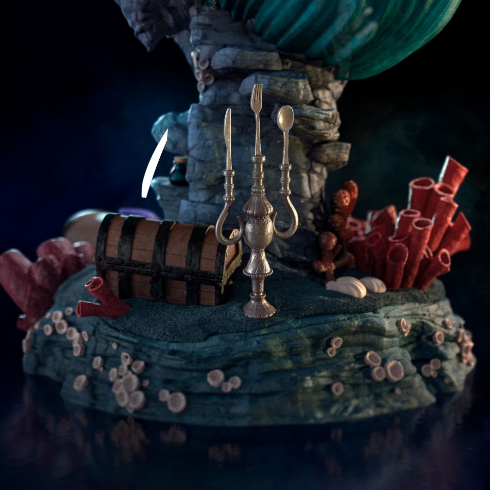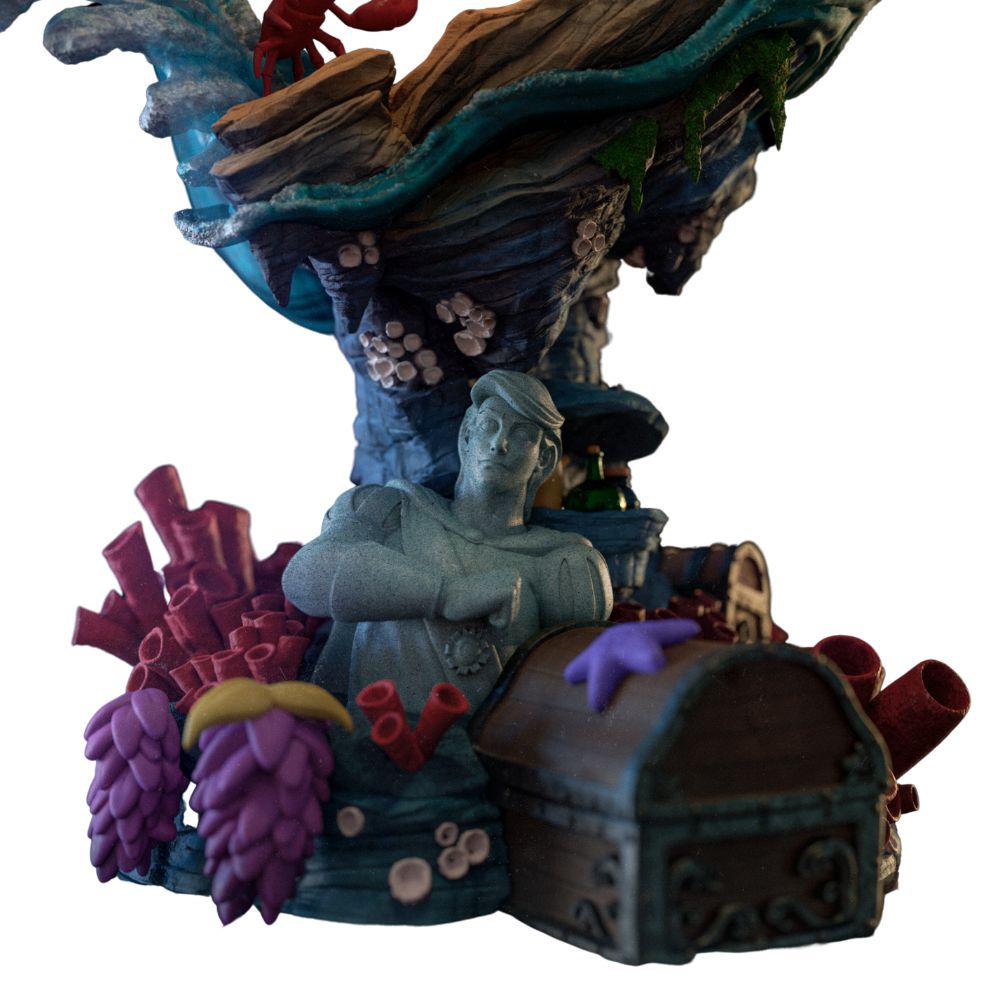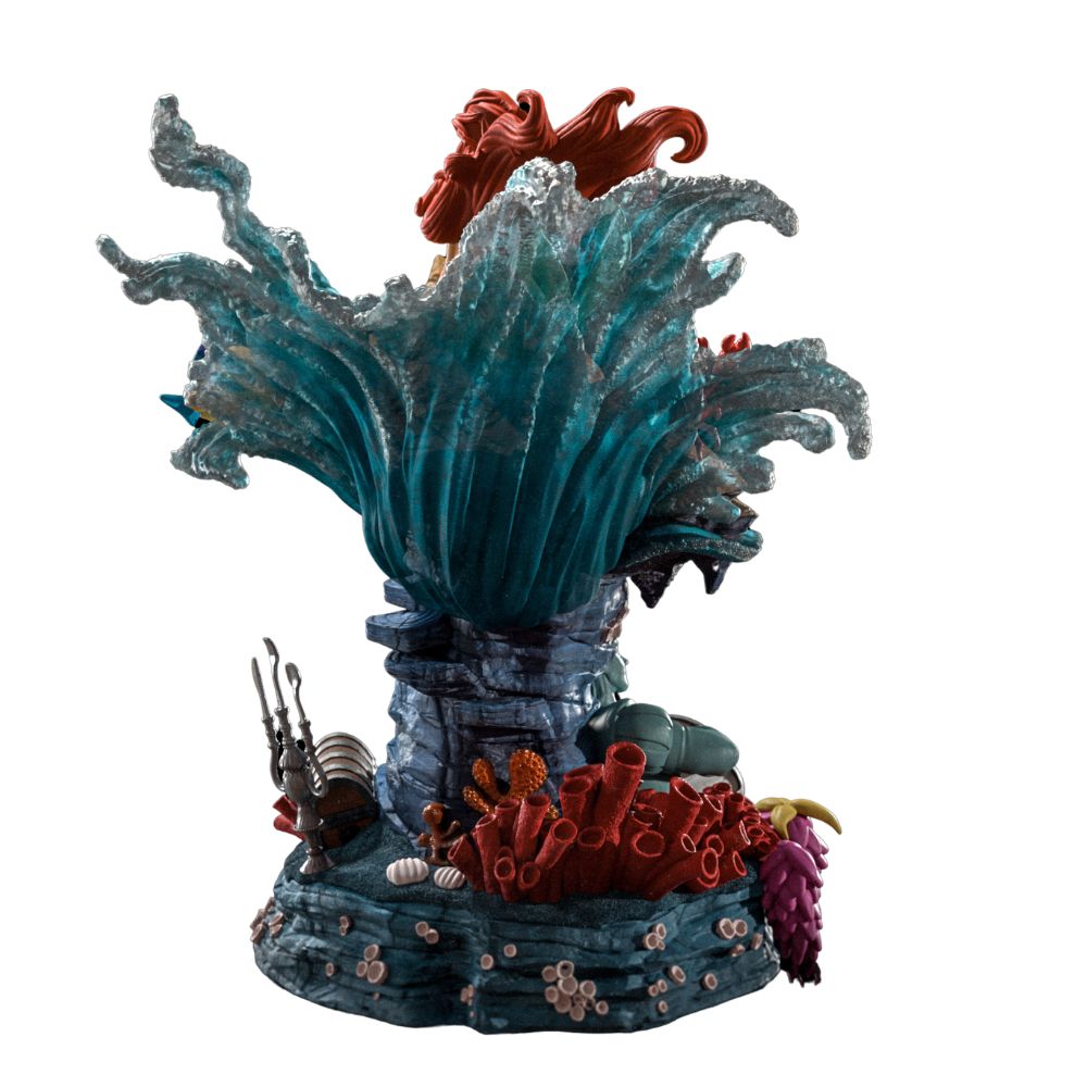 Souriante et enthousiaste, la jeune princesse d'un royaume sous-marin penche son petit corps, mi-humain, mi-poisson, sur un socle de rocher marin de son endroit spécial, où elle garde son vaste trésor, une collection d'objets humains, d'antiquités et d'artefacts, représentant des souvenirs particuliers de ses aventures et de nouvelles découvertes dans des épaves de bateaux, des grottes et même à la surface de la mer. Une collection composée de gadgets, de bidules, de whosits, de whatsits et de thingamabobs comme elle les appelle, mais qui sont en fait des coffres, de l'argenterie sur un chandelier, de la poterie, des bouteilles et bien plus encore, soigneusement conservés dans la grotte secrète d'Ariel. Iron Studios est fier de présenter la statue "The Little Mermaid Deluxe - Disney Classics 100 Years - Art Scale 1/10", avec la jolie Petite Sirène en version Deluxe, sur un socle diorama, suivie de ses amis Flounder et Sebastian dans sa grotte avec les trésors, y compris même une statue du Prince Eric.