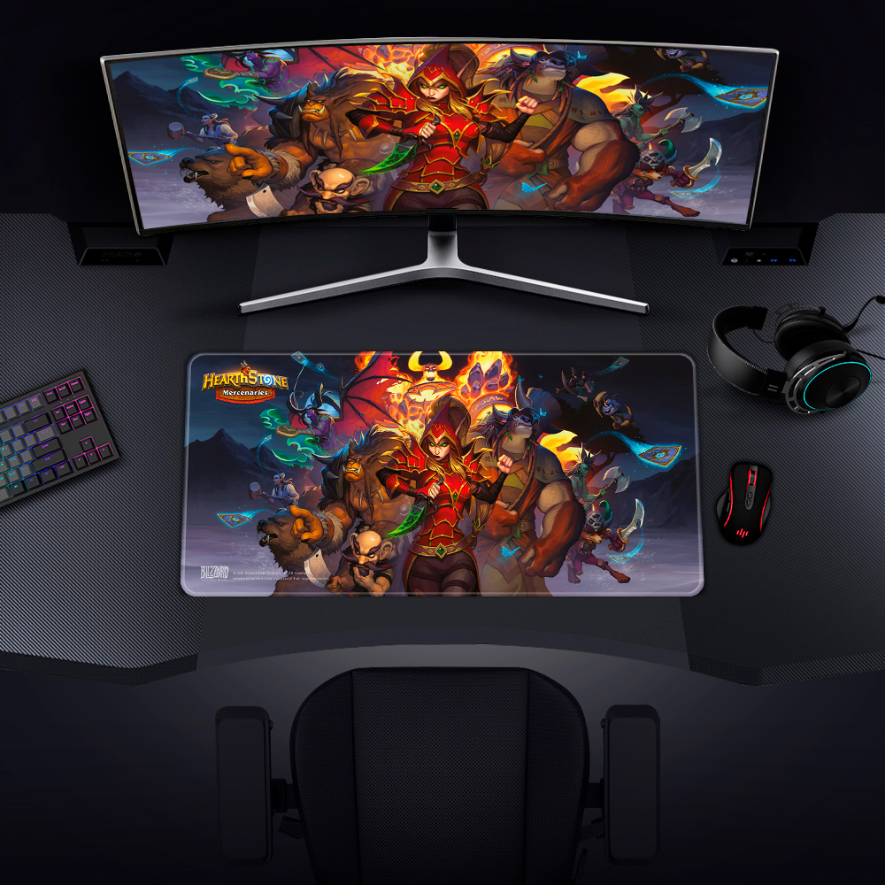 This gaming mousepad features an impressive design inspired by the mercenaries of the popular digital card game, Hearthstone. The mousepad showcases illustrations of several mercenaries from the game, each with their unique armor, weapons, and abilities. The heroes are depicted in vivid detail, with intricate designs, and bold colors, perfectly capturing the whimsical and fantastical world of Hearthstone. This mousepad is perfect for Hearthstone fans looking for a comfortable and responsive surface to enhance their gaming experience, while also showcasing their love for the world of the popular card game.