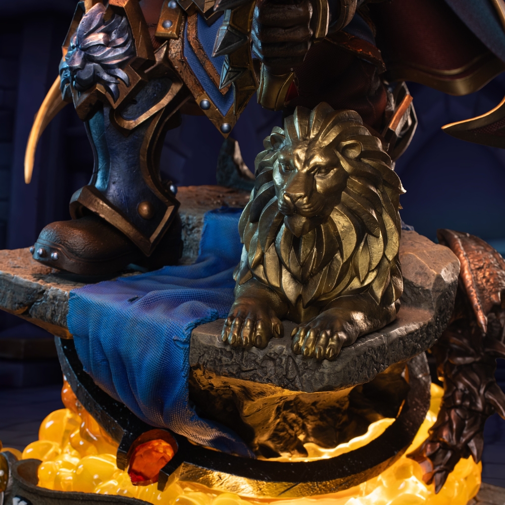 Varian strides down the steps with unwavering resolve, exuding a commanding presence. His flowing hair and stern expression are sculpted with precision, faithfully capturing the essence of the original card art. In his hands, he wields Ellemayne and Shalla'tor—each blade featuring a translucent resin core that recreates their signature orange and blue glow, while metallic gradient finishes emphasize the sharp edges of these iconic weapons. His armor displays a realistic metallic sheen enhanced with weathering and battle scars, reflecting the countless battles he has endured. The lion and gryphon heads on his pauldrons symbolize the fearless spirit of Stormwind.