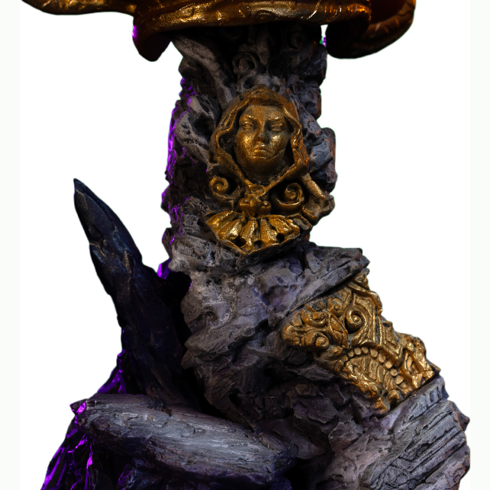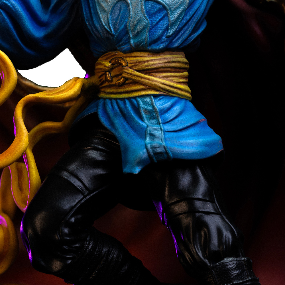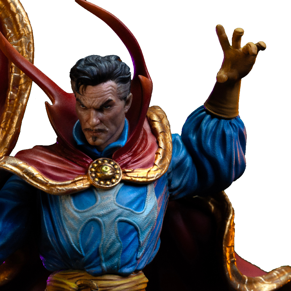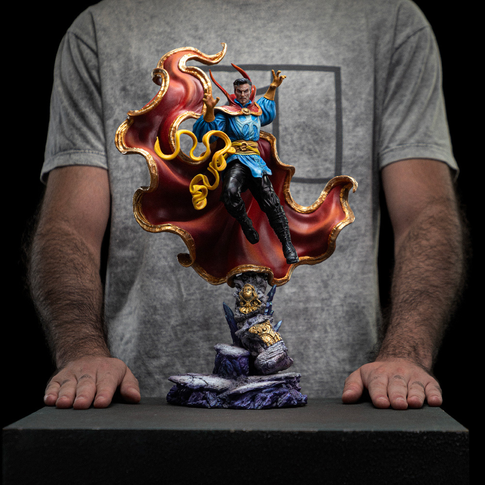 szigorú arccal és metsző szemekkel , a mellkasán az Agamotto szeme nevű hatalmas ereklyét viselve, az Iron Studios bemutatja a klasszikus változatát a