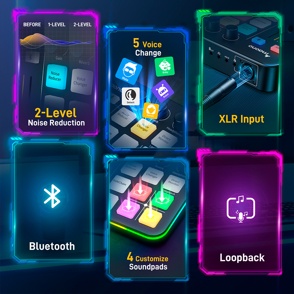 Bluetooth accompaniment input allows you to add background music effortlessly, while one-click mute and Loopback functions provide greater freedom during live streams.