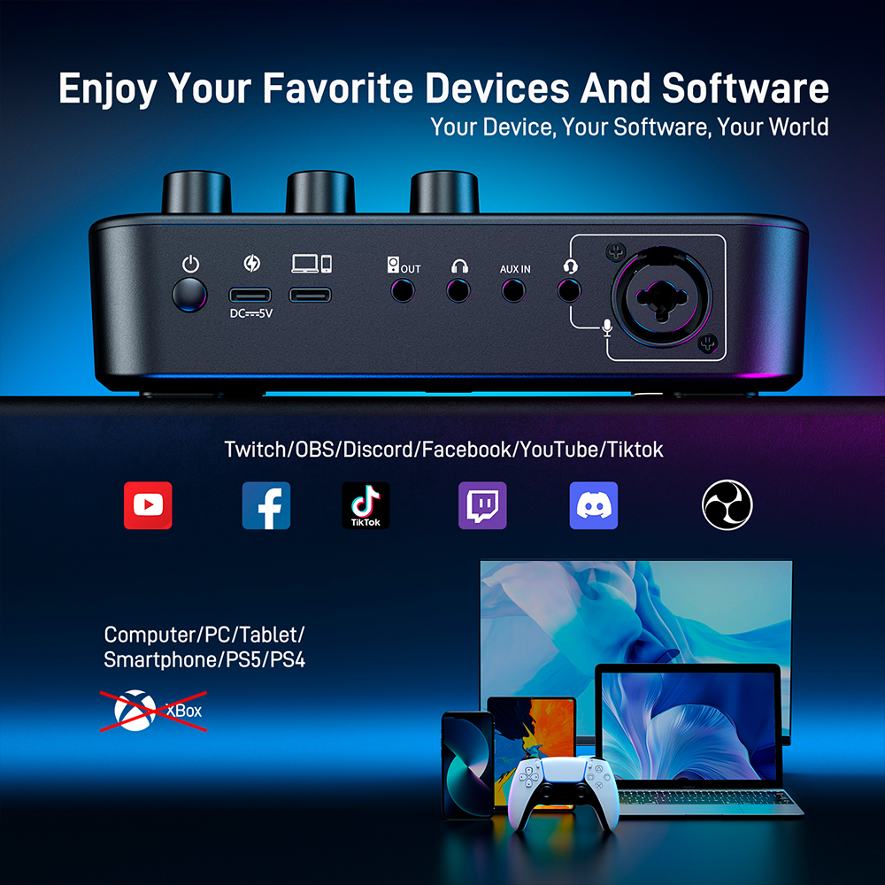 The G1 NEO is compatible with Headphones, XLR Microphones, Personal Computers, Smartphones, and Tablets.