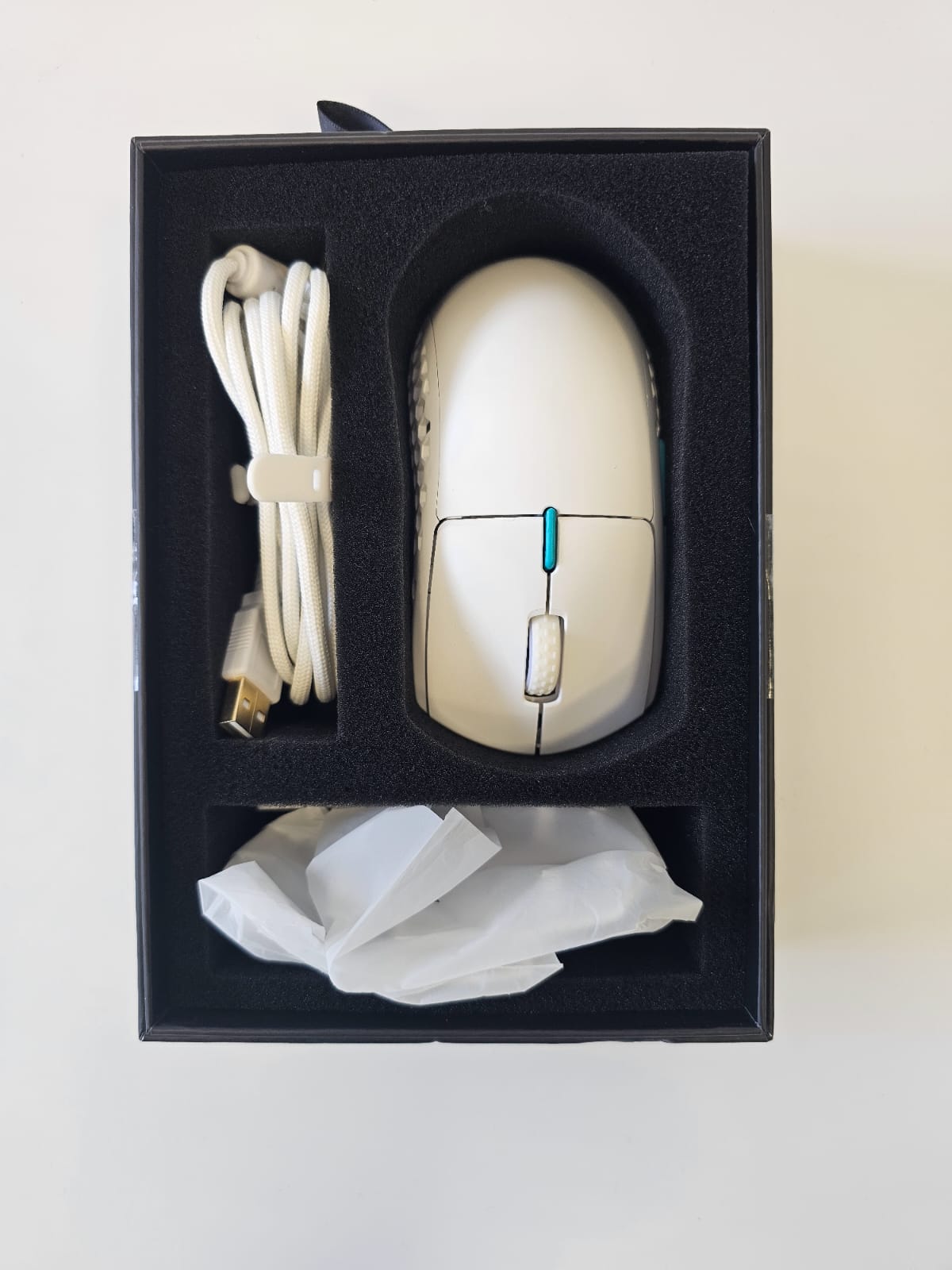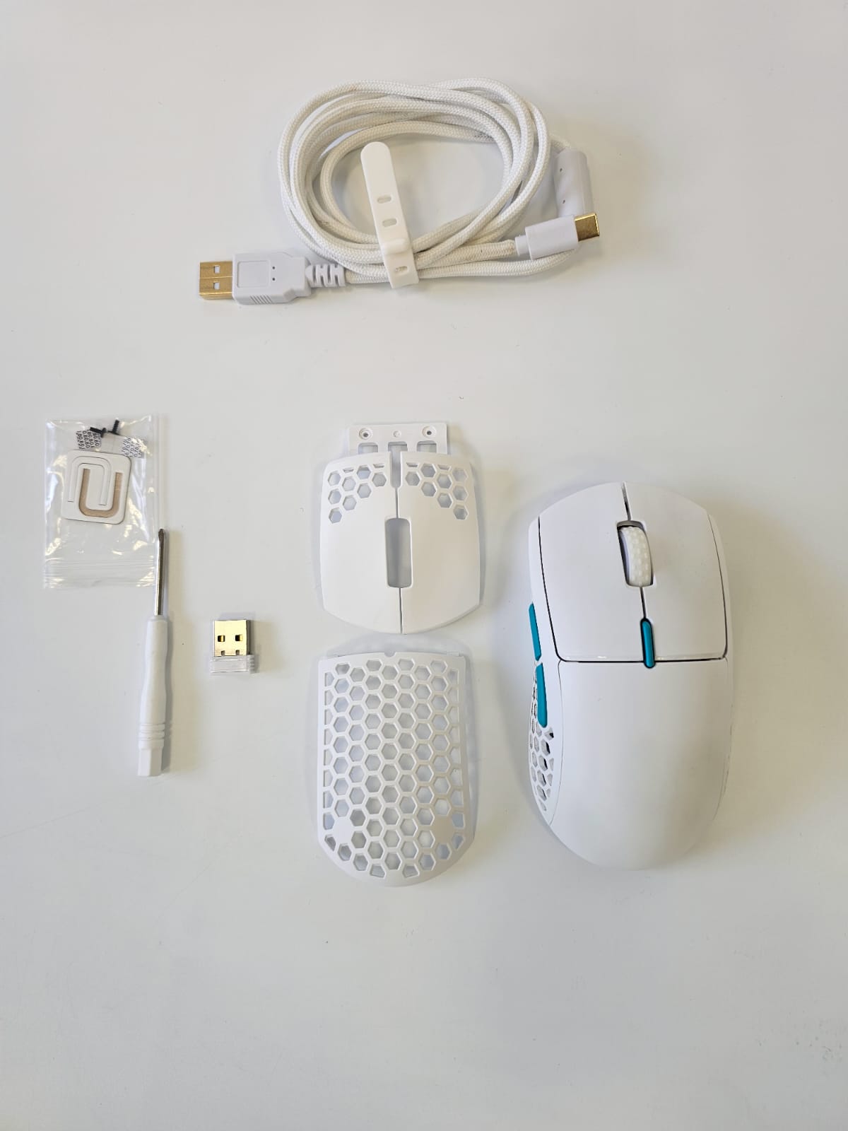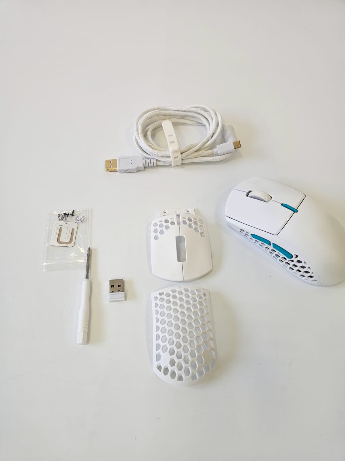 The mouse has been unboxed and used. After a brief inspection, it appears to be in perfect condition and works as intended. All parts, including screws, spare screw covers, screwdriver, USB dongle, and cables, are included in the package.