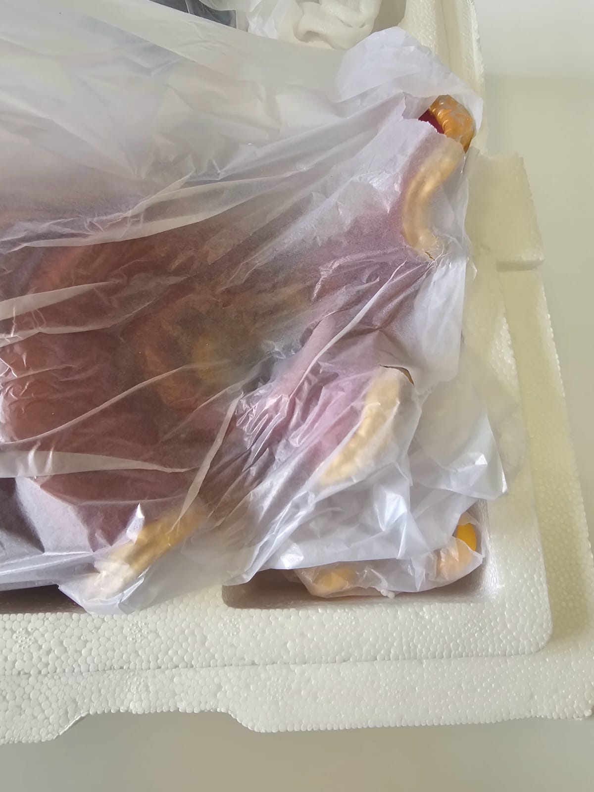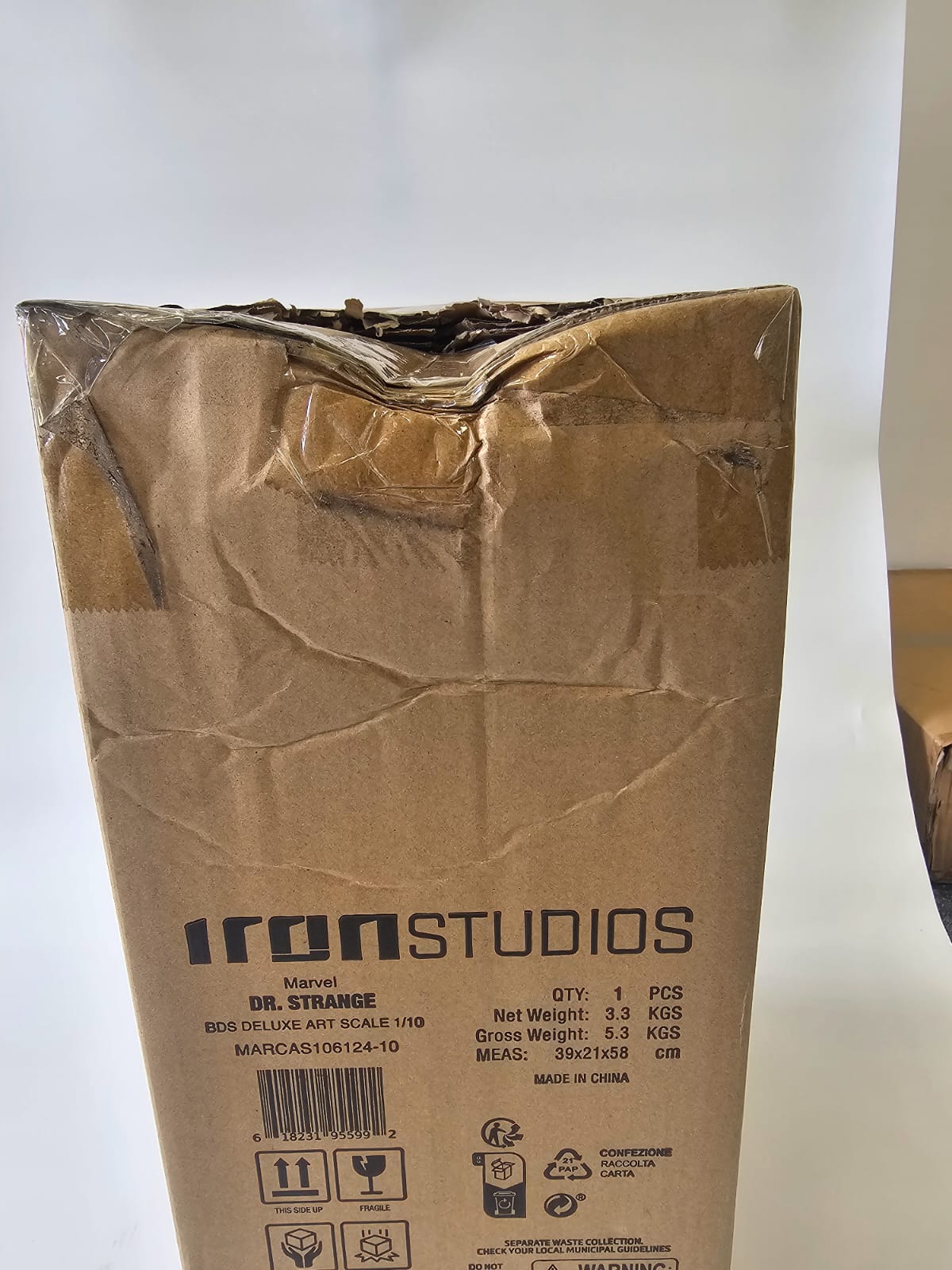 Damage – during transport from the manufacturer to the warehouse, the outer brown box, the colored box, and the inner white foam packaging were damaged. However, this had no impact on the statue's quality. The statue is in top condition, complete, and undamaged – more visible in the photo.