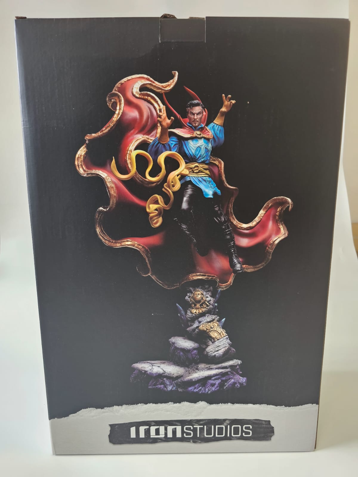 a stern countenance and incisive eyes , wearing the powerful artifact called the Eye of Agamotto on his chest , Iron Studios presents the classic version of the