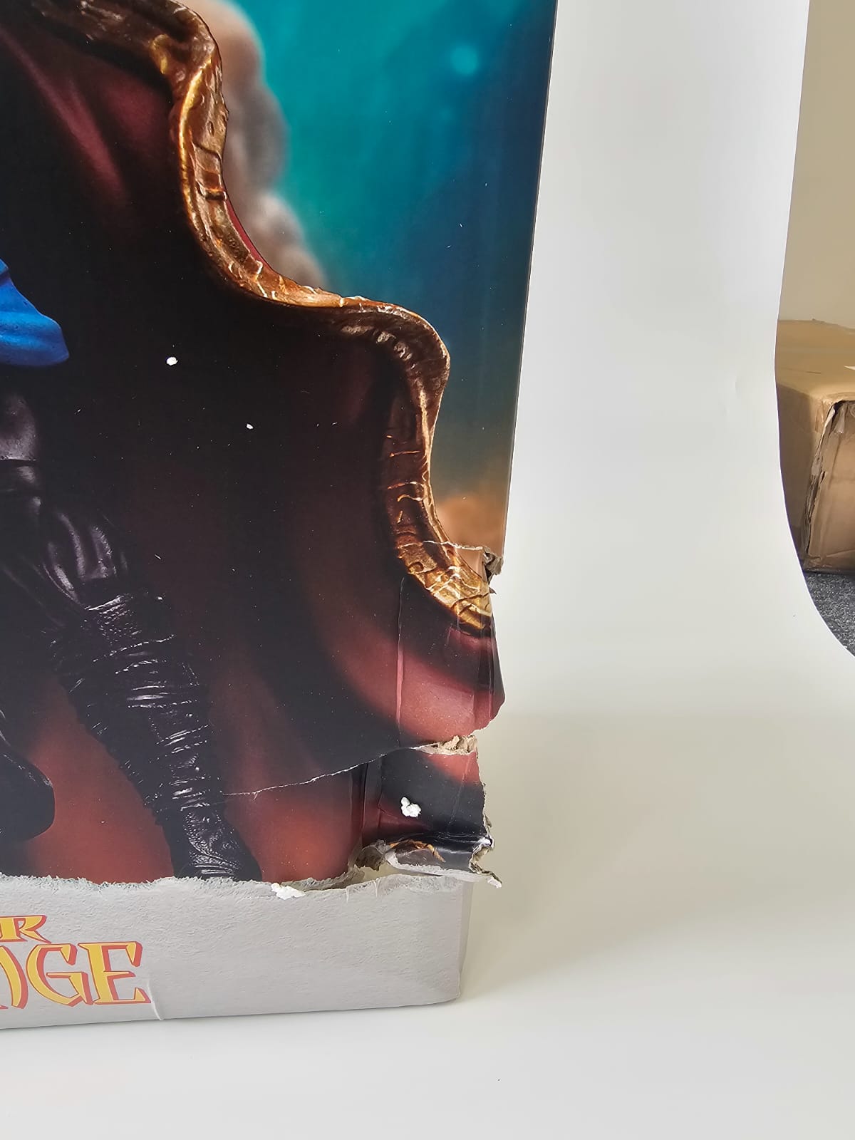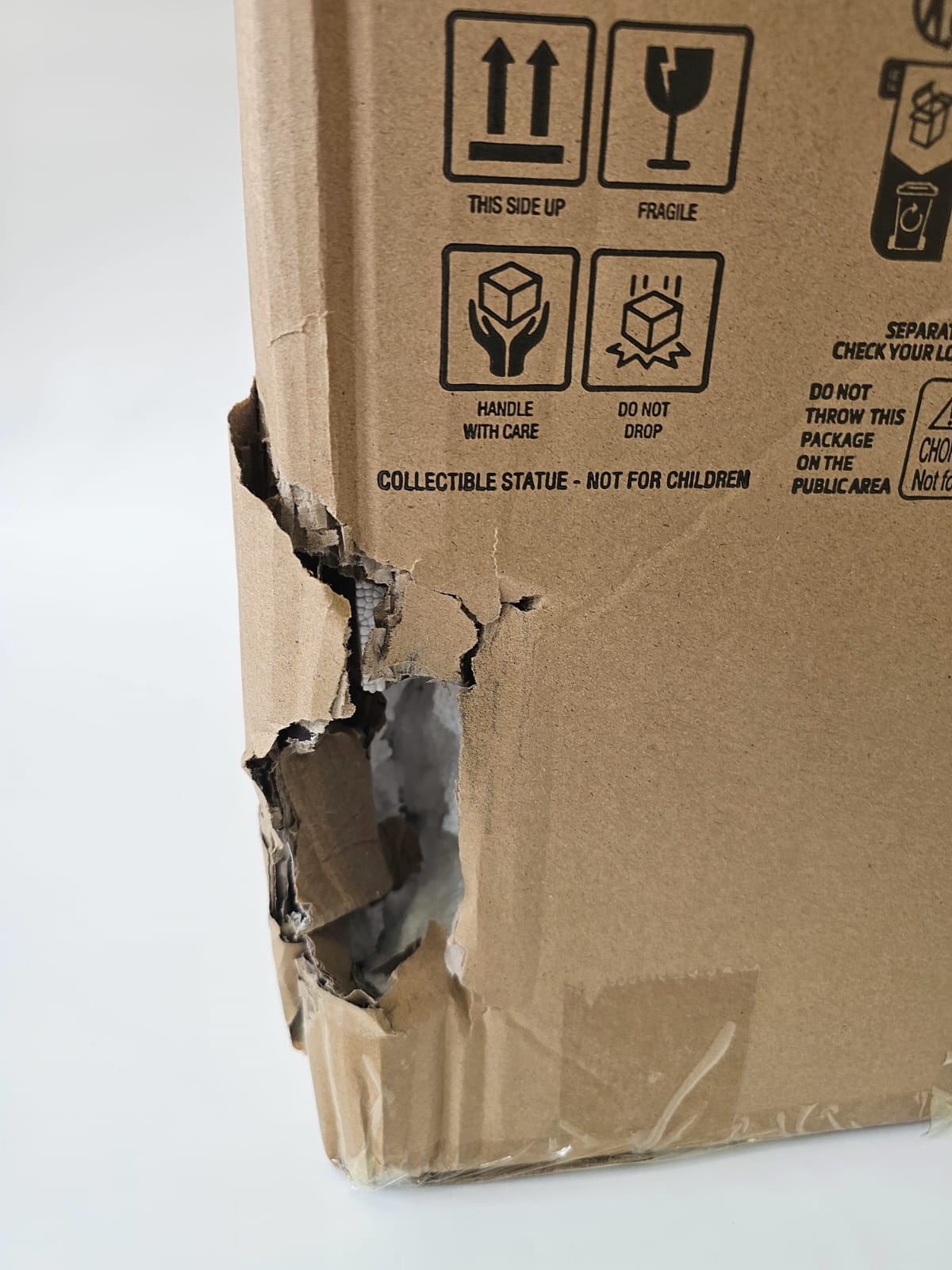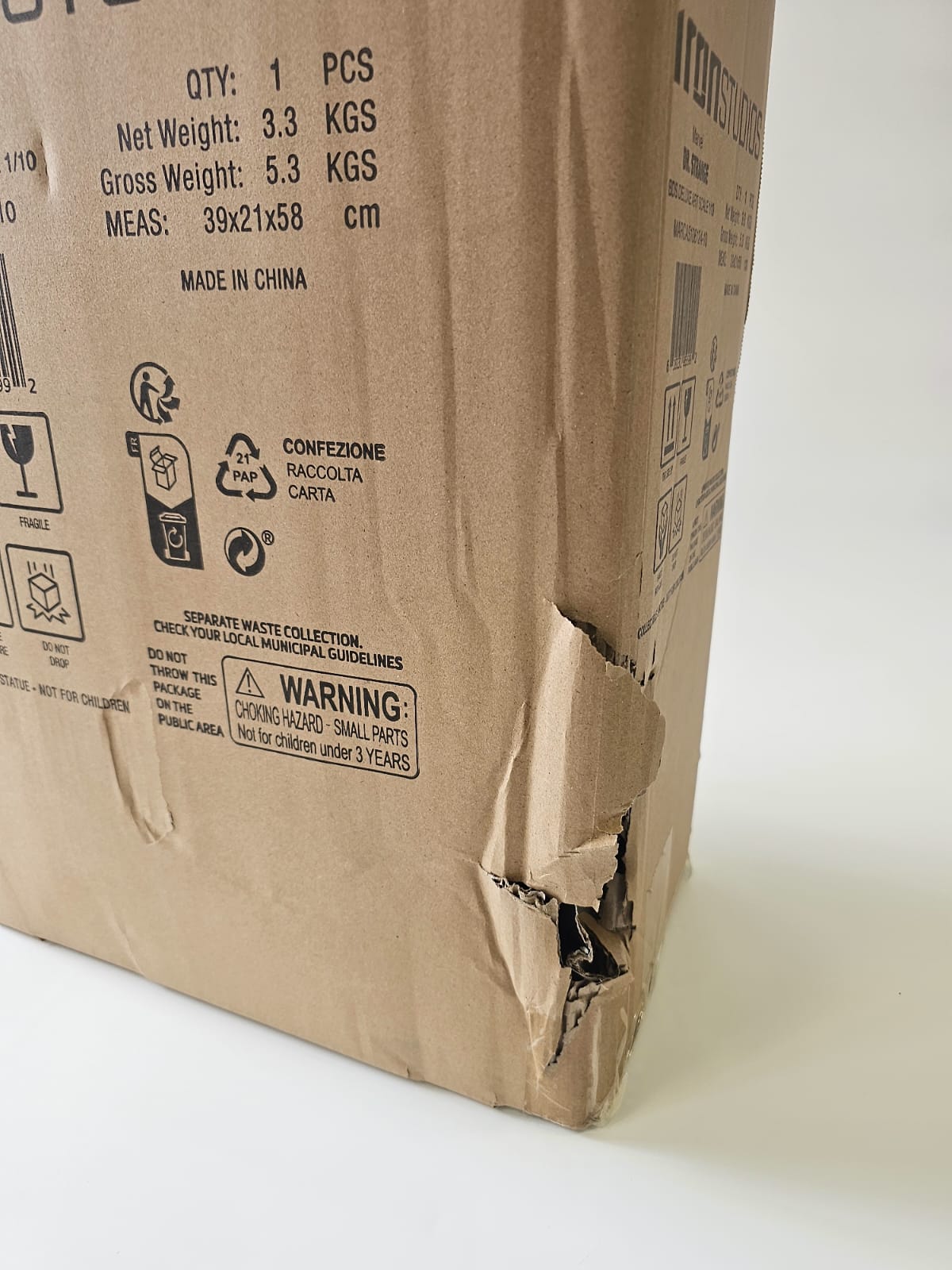 Damage – during transport from the manufacturer to the warehouse, the outer brown box, the colored box, and the inner white foam packaging were damaged. However, this had no impact on the statue's quality. The statue is in top condition, complete, and undamaged – more visible in the photo.
