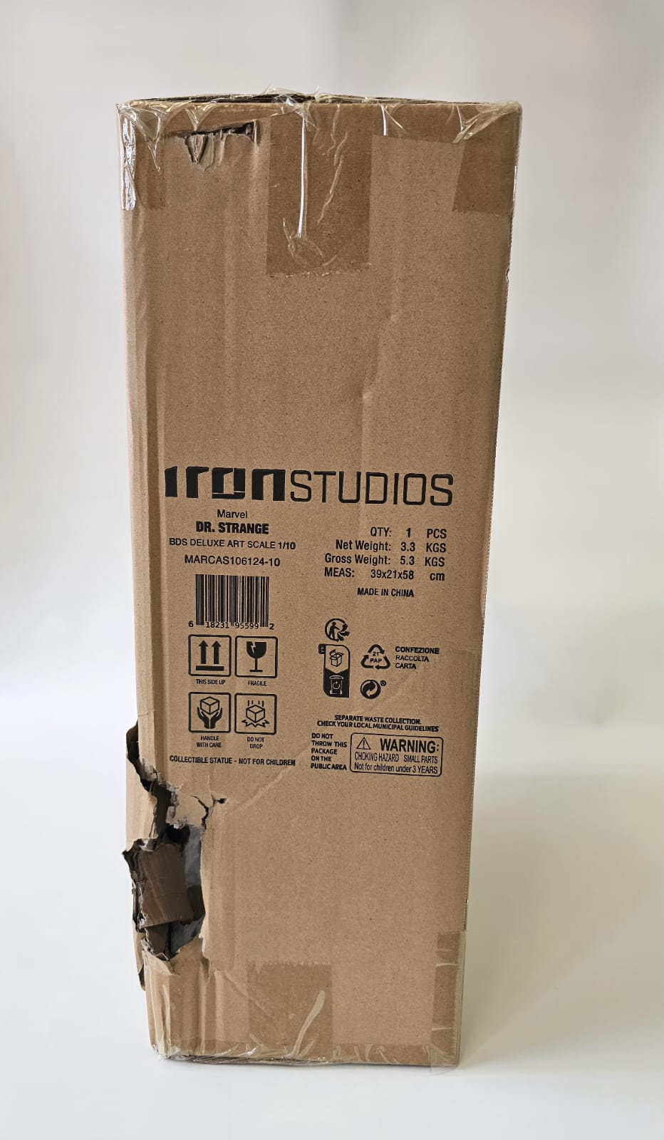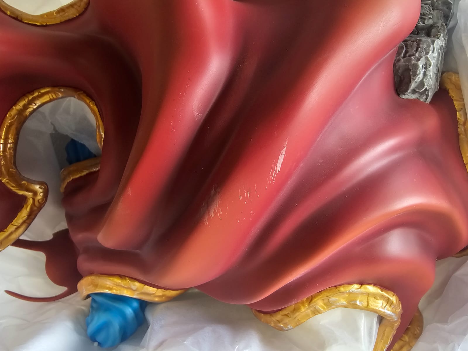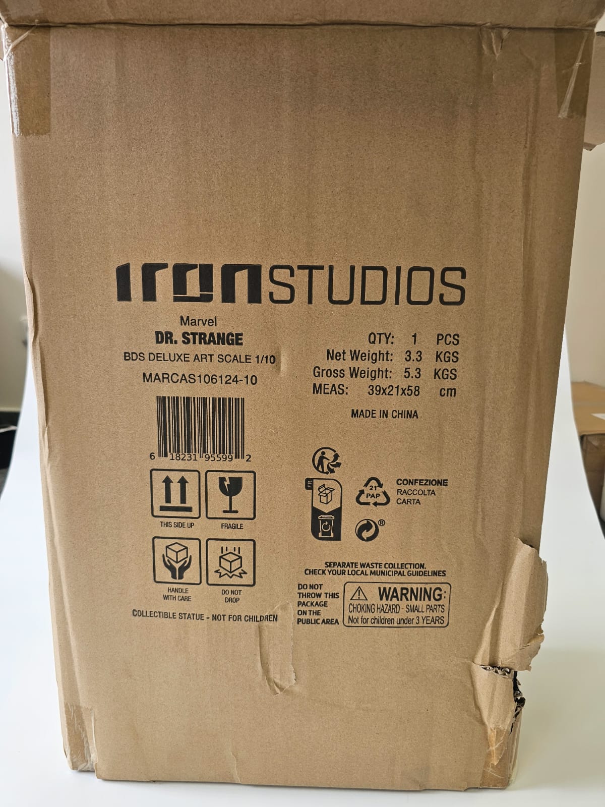 Damage – during transport from the manufacturer to the warehouse, the outer brown box, the colored box, and the inner white foam packaging were damaged. However, this had no impact on the statue's quality. The statue is in top condition, complete, and undamaged – more visible in the photo.
