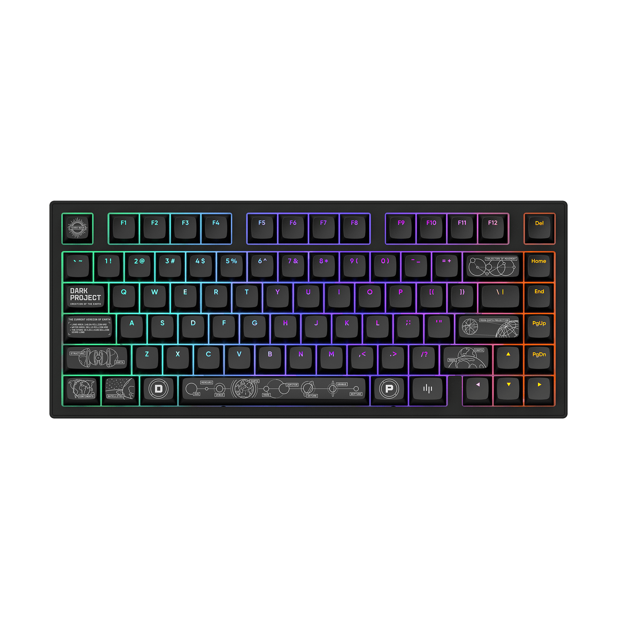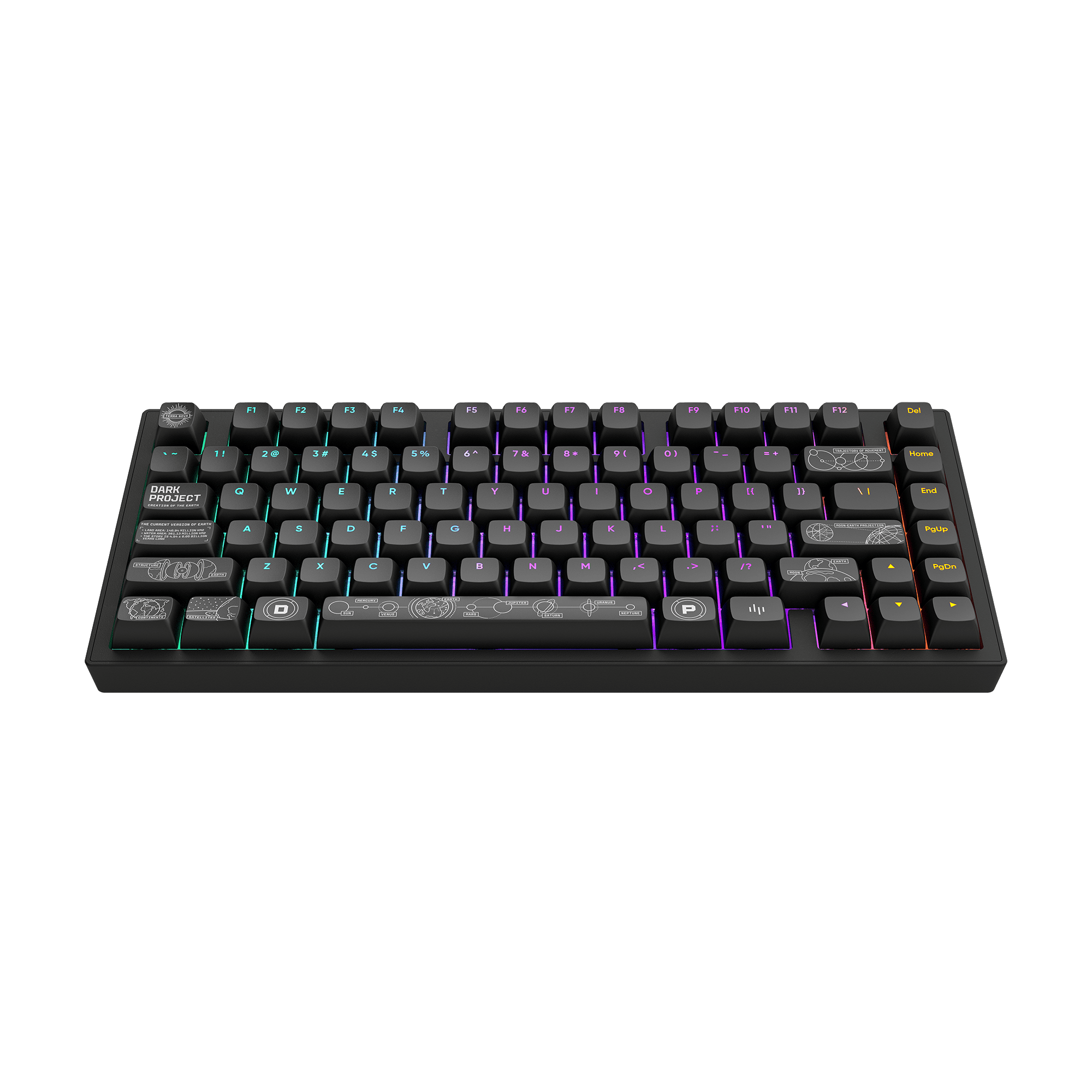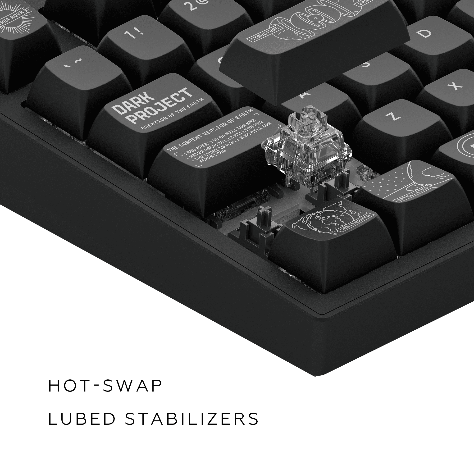 Găzduită într-un corp complet din aluminiu cu schițe cosmice complicate pe spate, are comutatoare G3MS Moonstone pre-lubrifiate pentru o tastare ultra-lină și taste PBT sublimate cu vopsea care afișează ilustrații uimitoare ale sistemului solar și ale straturilor Pământului. Fiecare caracteristică este creată pentru a vă îmbunătăți experiența - de la conectivitatea fără fir pentru o libertate fără întreruperi la comutatoarele interschimbabile la cald pentru o personalizare maximă.