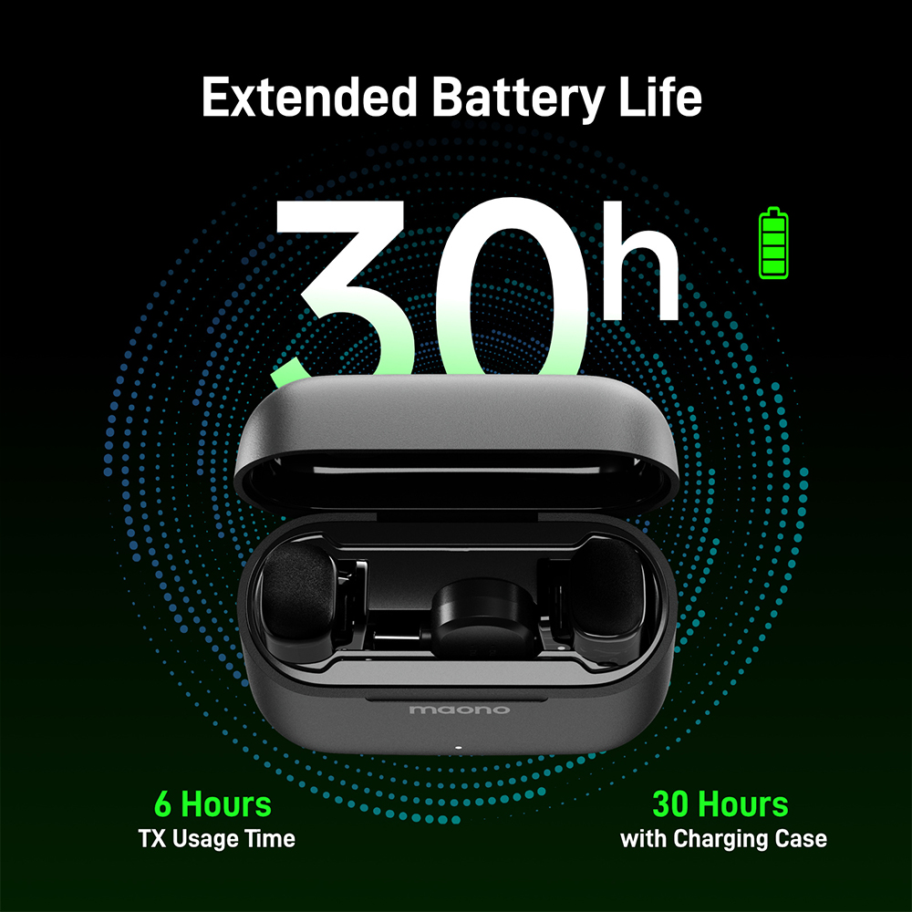 Up to 50 m transmission range and up to 30 hours total runtime with the charging case (varies by environment and use).